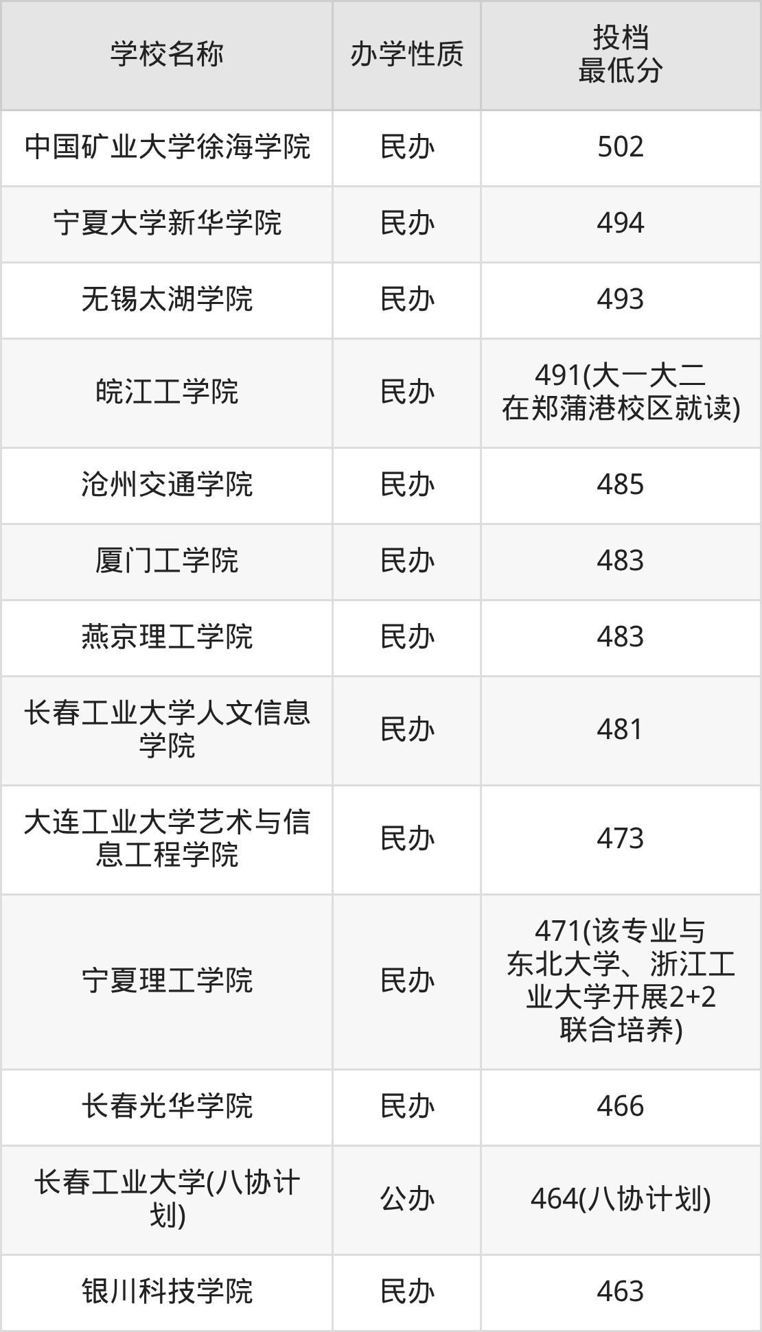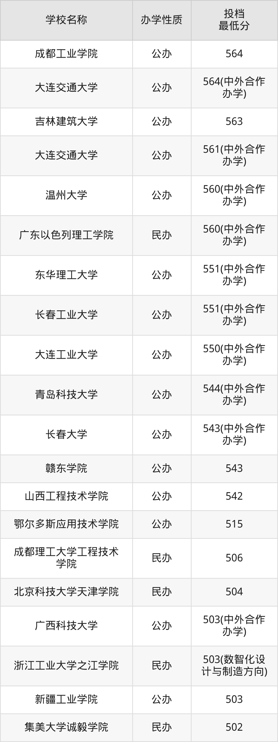 500分左右的机械工程大学:集美大学诚毅学院502分、中国矿业大学徐海学院502分、广西科技大学503分(中外合作办学)、浙江工业大学之江学院503分(数智化设计与制造方向)、新疆工业学院503分等;