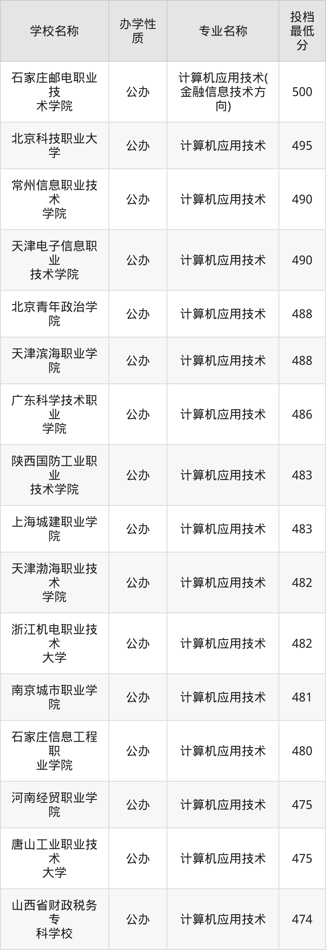 500分左右的计算机应用技术大学有:石家庄邮电职业技术学院500分、北京科技职业大学495分、常州信息职业技术学院490分、天津电子信息职业技术学院490分、北京青年政治学院488分。