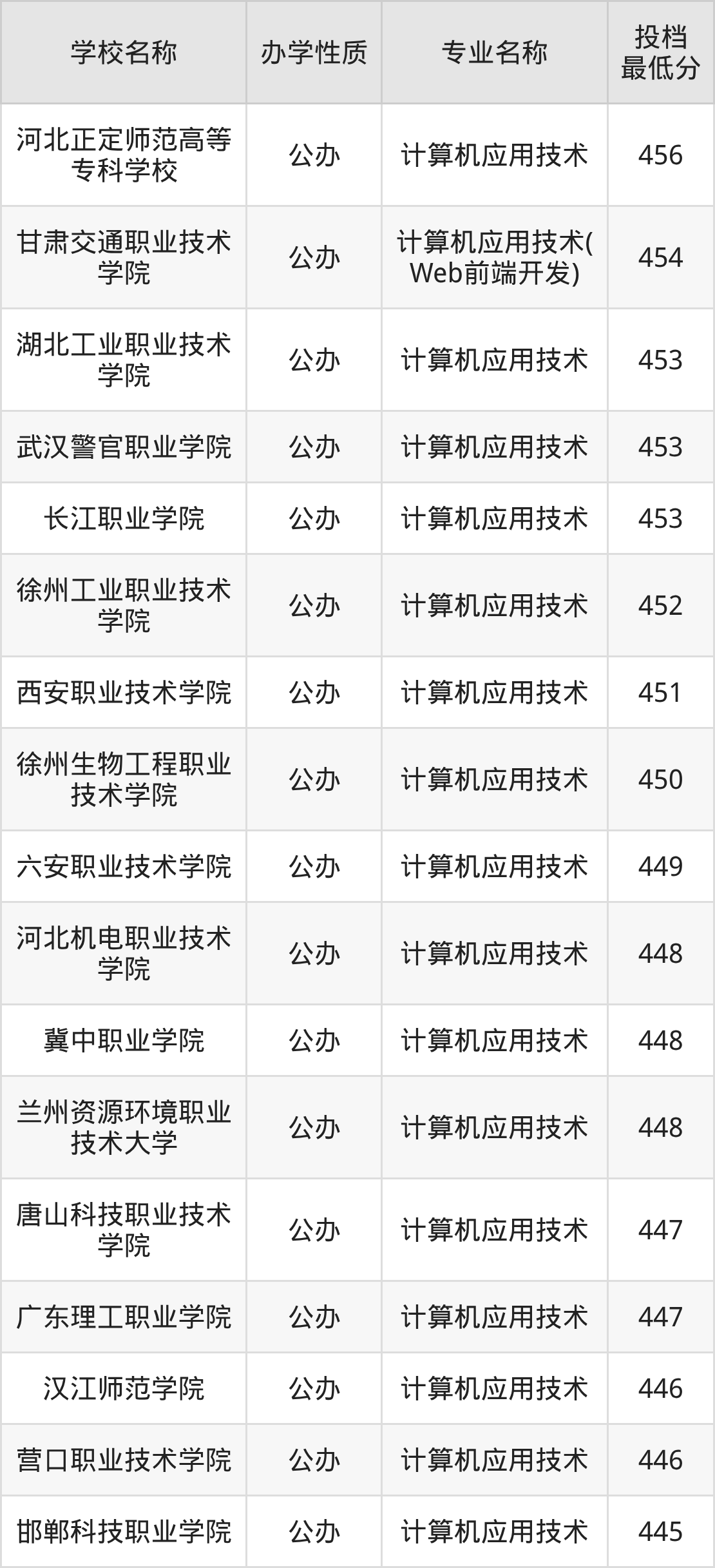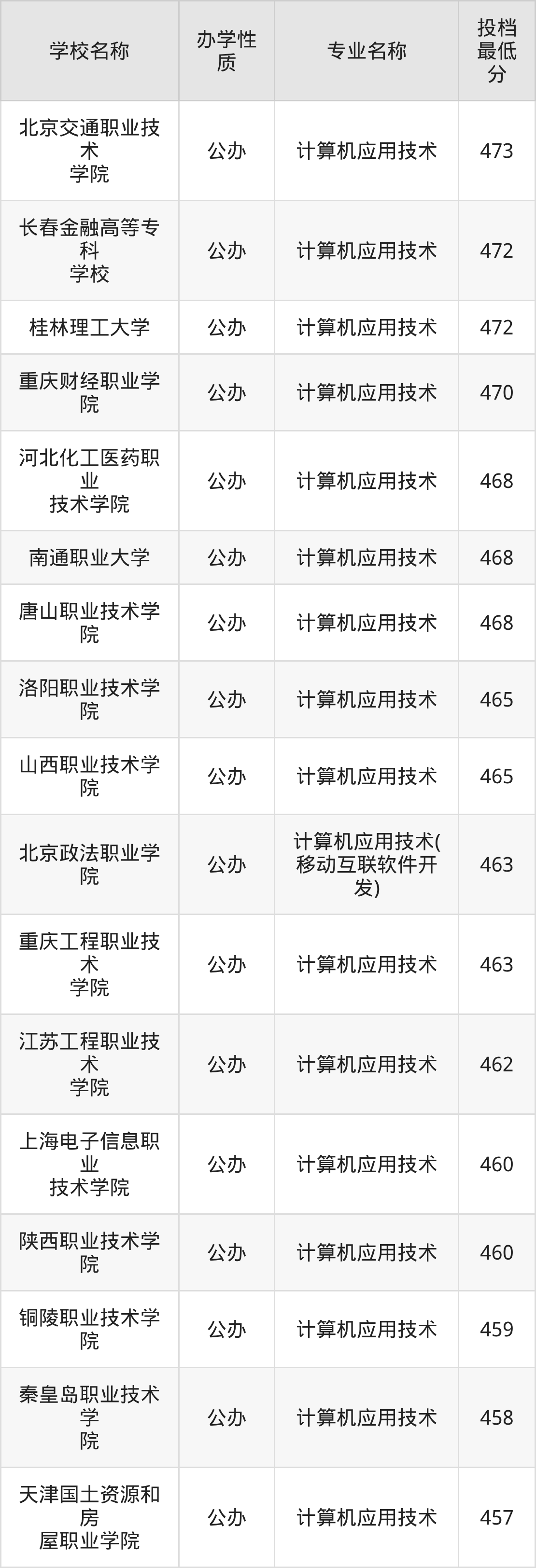 450分左右的计算机应用技术大学有:重庆财经职业学院470分、河北化工医药职业技术学院468分、南通职业大学468分、唐山职业技术学院468分、洛阳职业技术学院465分。