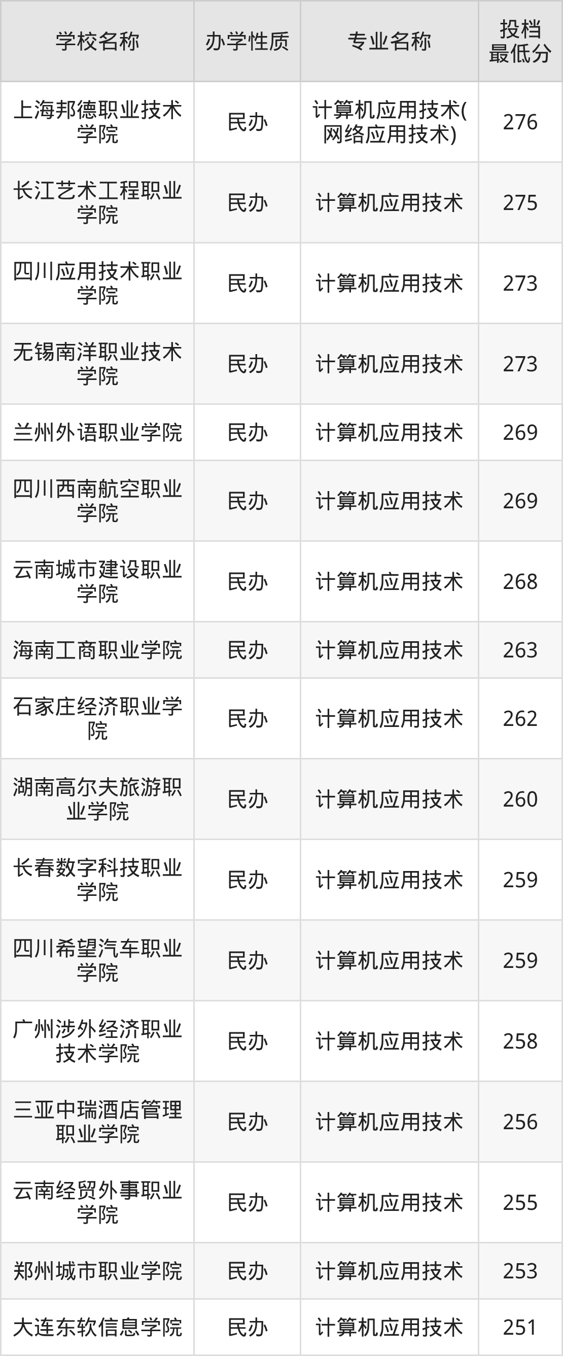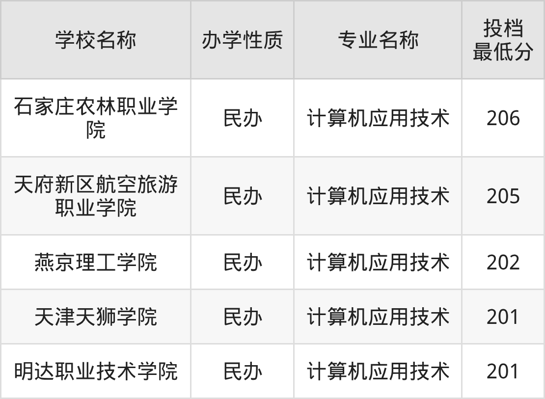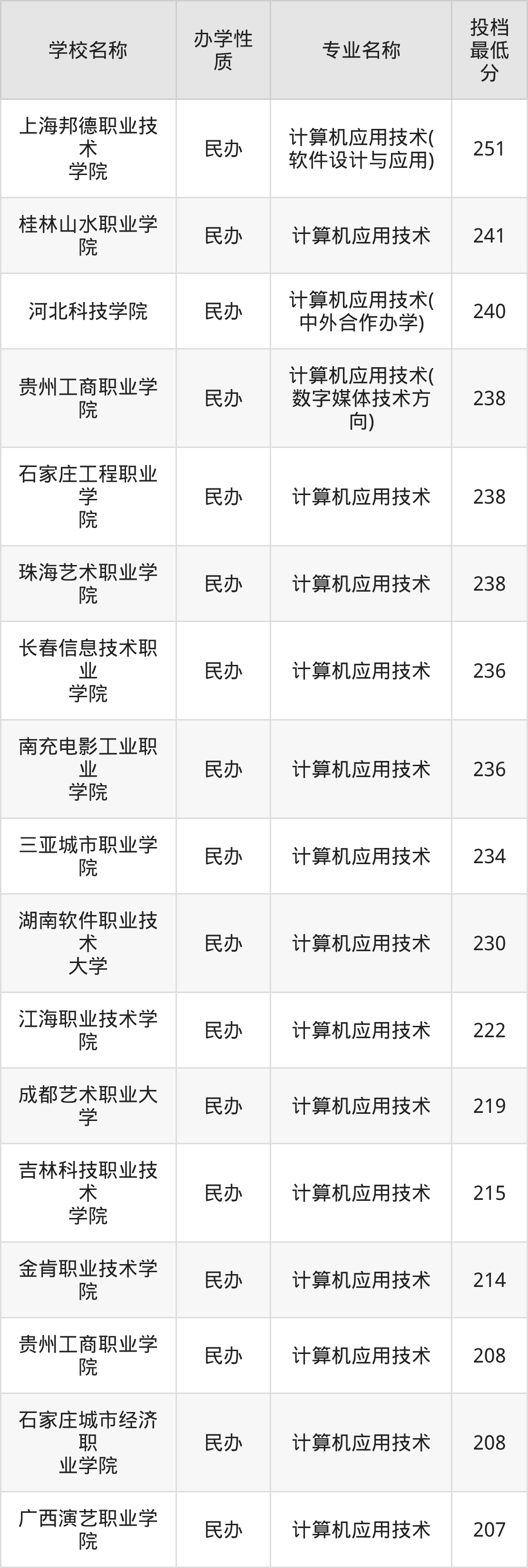 一般来说,计算机应用技术都需要200分以上才能被录取,当然分数线因省份、科类而不同。从河北省2025年的招录数据来看,2025年计算机应用技术专业最低分是201分,而河北省专科线是200分,意味着考生至少需超过专科线1分才能上。