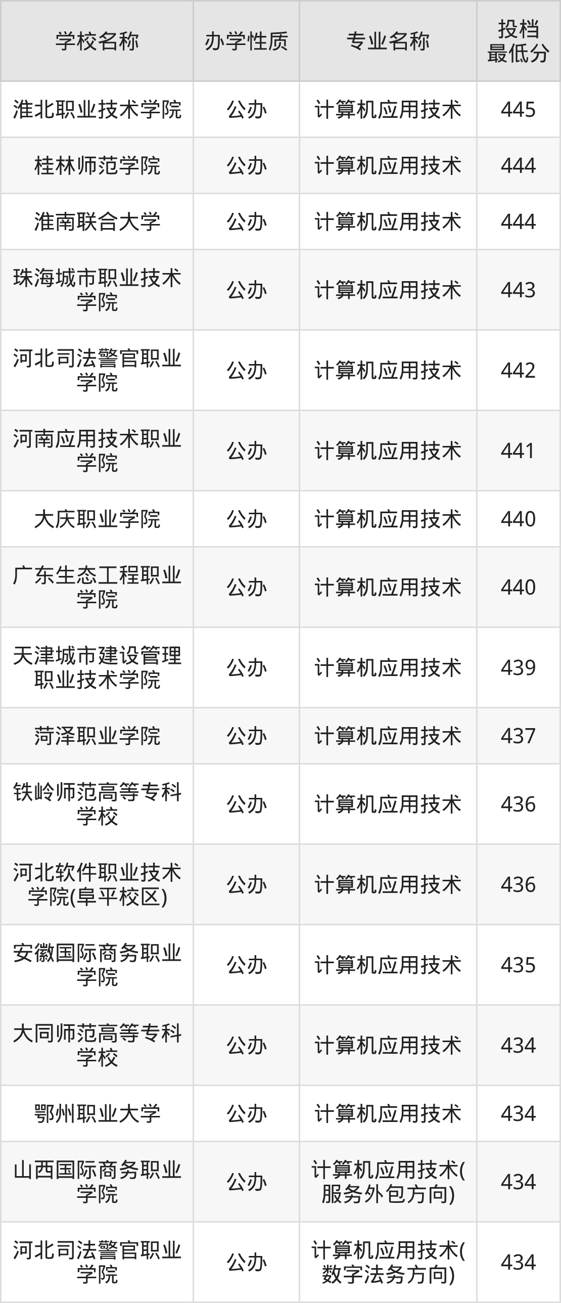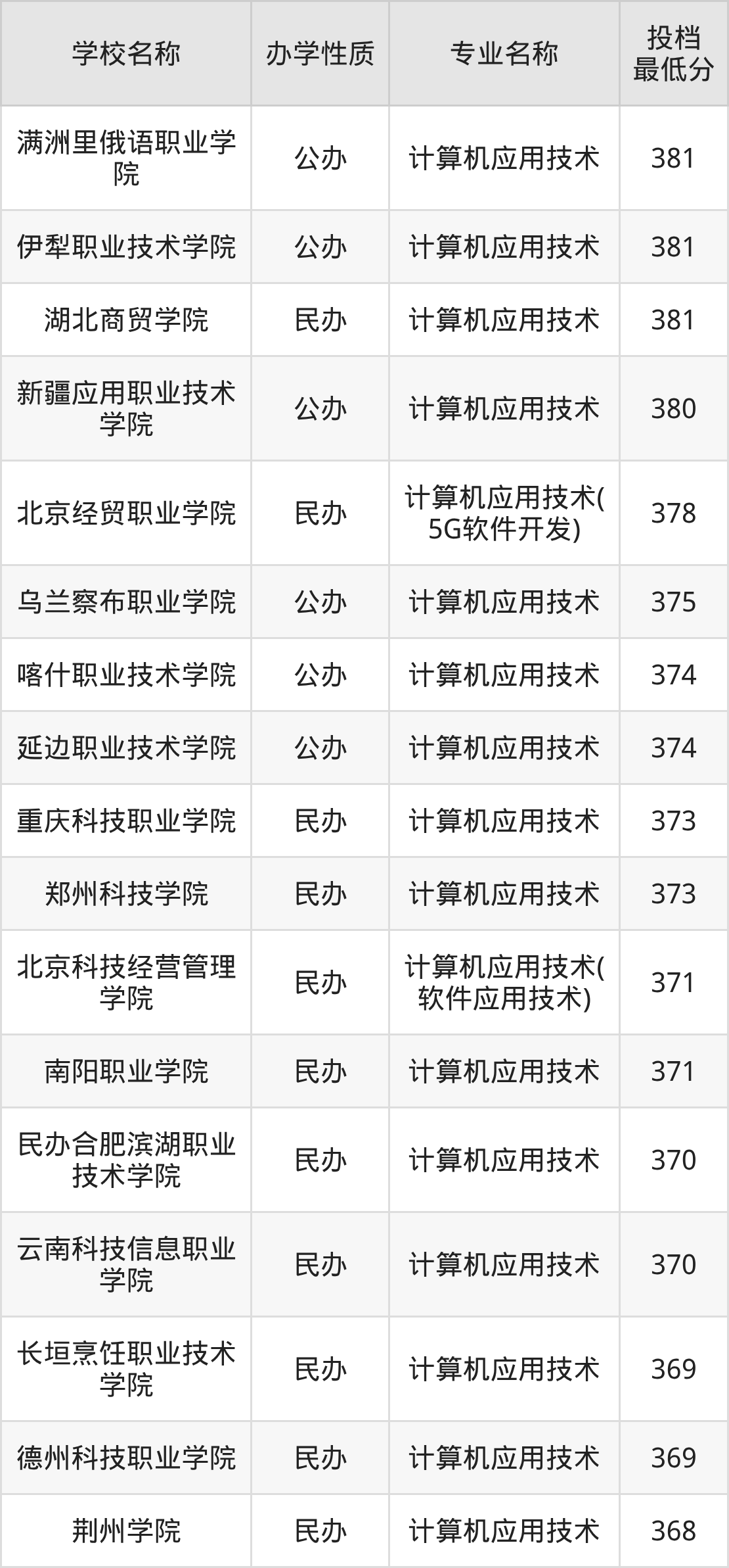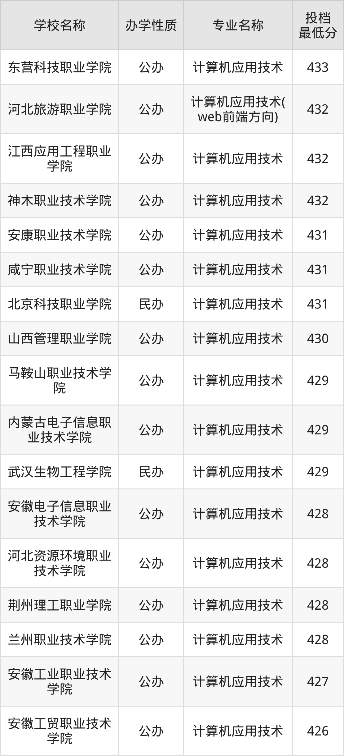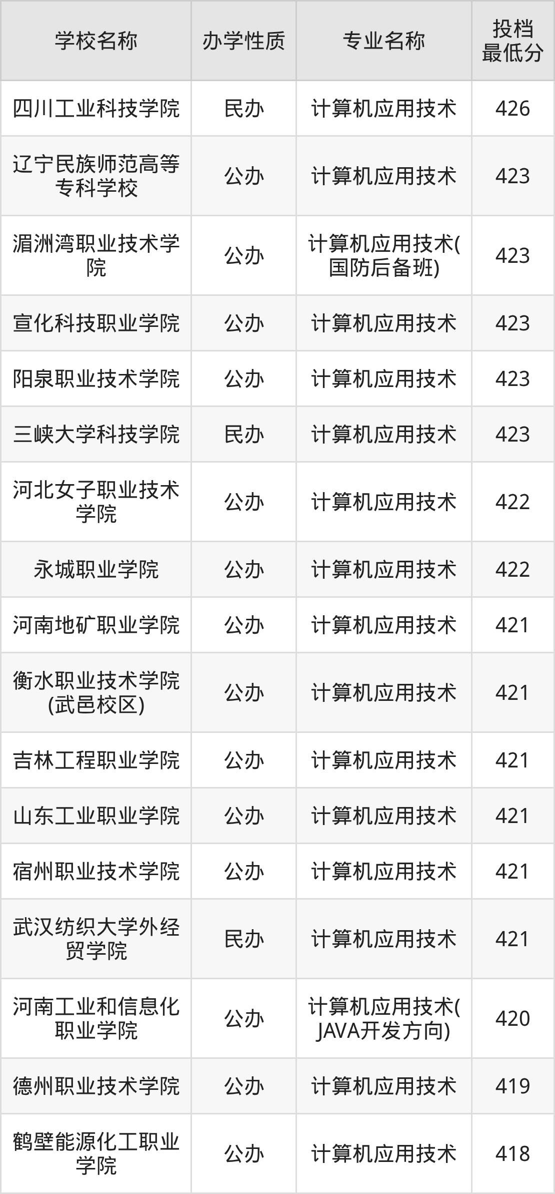 400分左右的计算机应用技术大学有:河南工业和信息化职业学院420分、德州职业技术学院419分、鹤壁能源化工职业学院418分、河北工艺美术职业学院417分、河北青年管理干部学院416分。