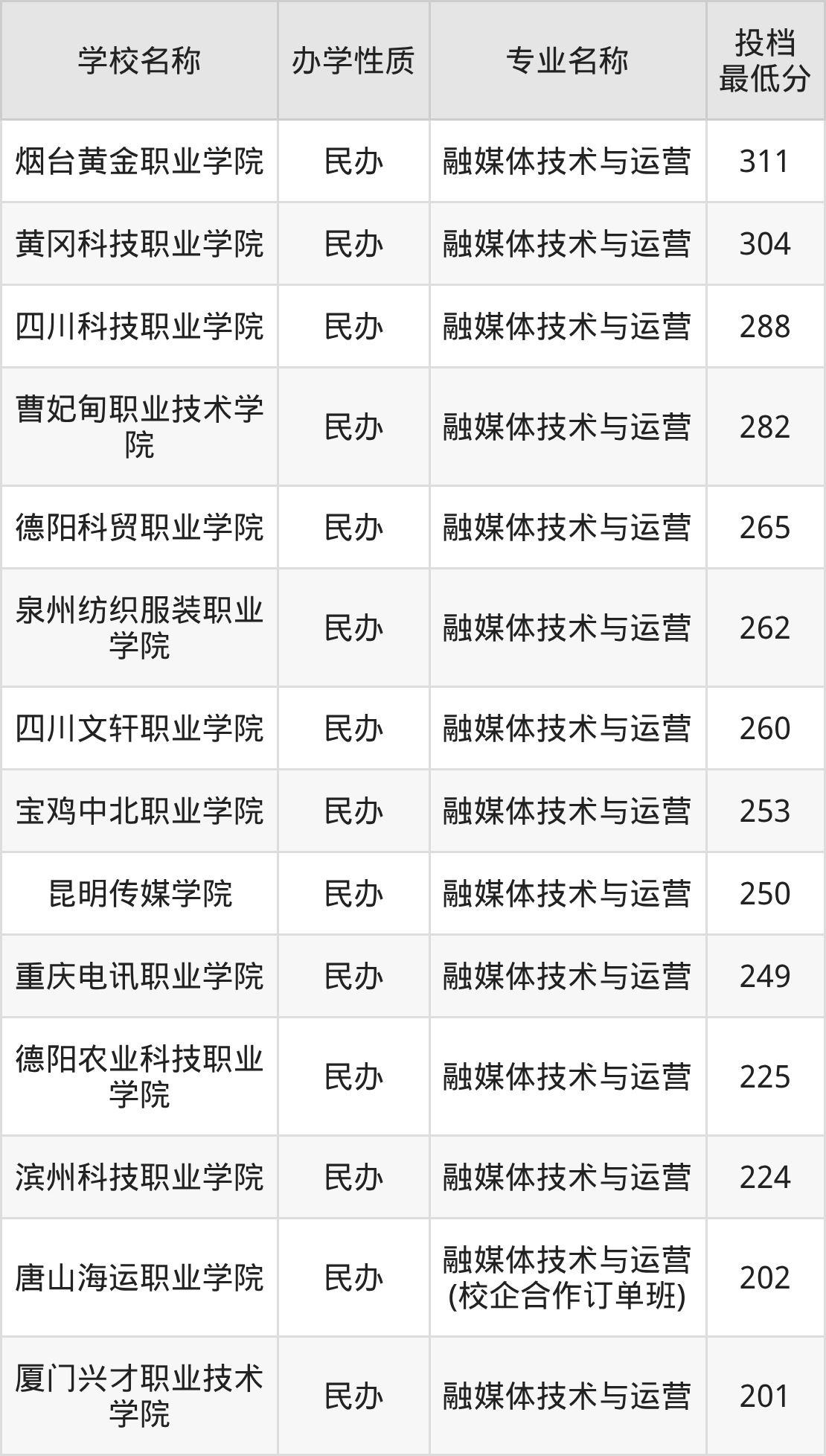 300分左右的融媒体技术与运营大学有:烟台黄金职业学院311分、黄冈科技职业学院304分、四川科技职业学院288分、曹妃甸职业技术学院282分。