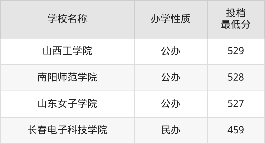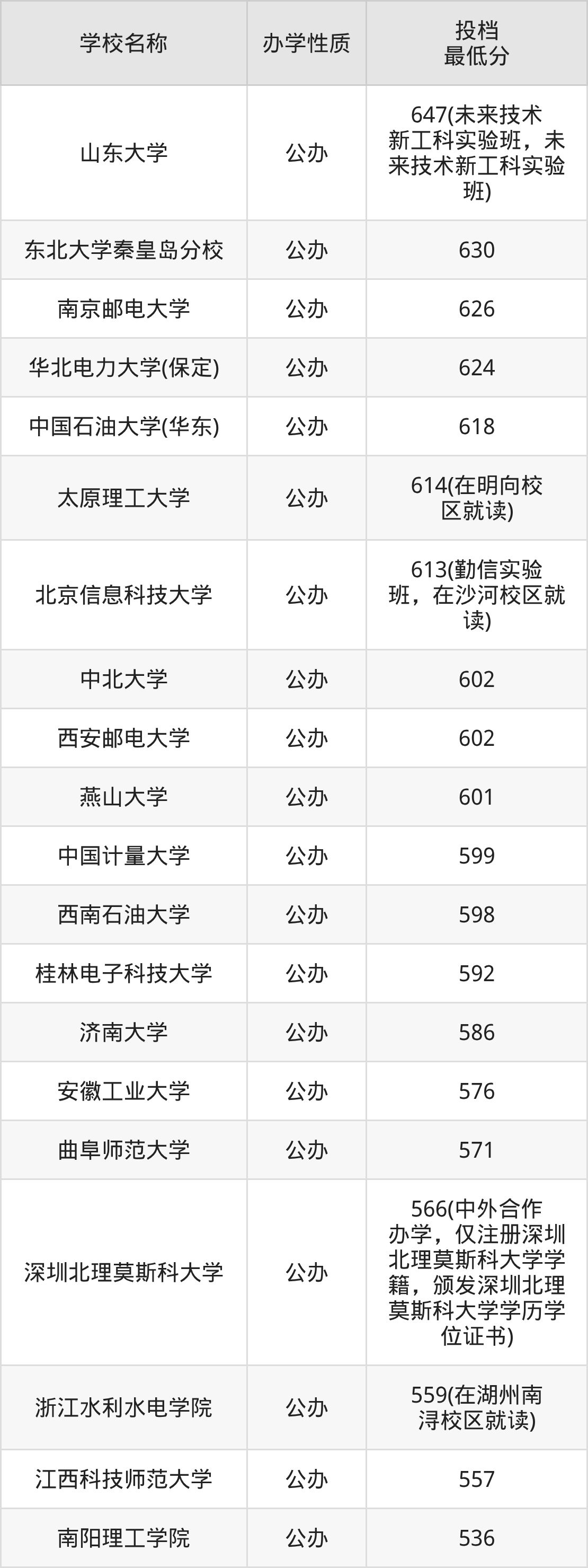 另外分数线比较低的大学还有南阳师范学院(528分)、山西工学院(529分)、南阳理工学院(536分)、江西科技师范大学(557分)、浙江水利水电学院(559分)等。