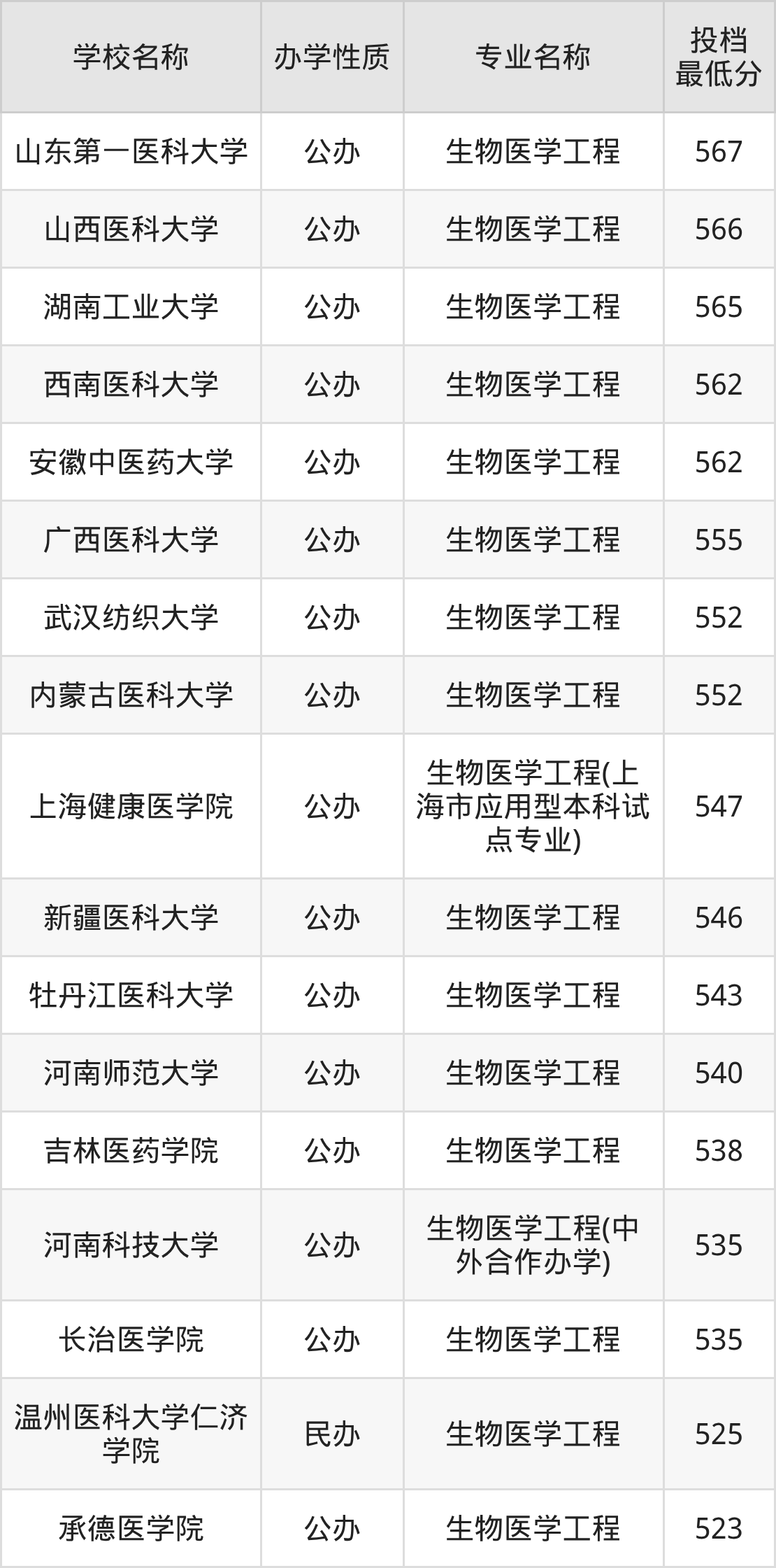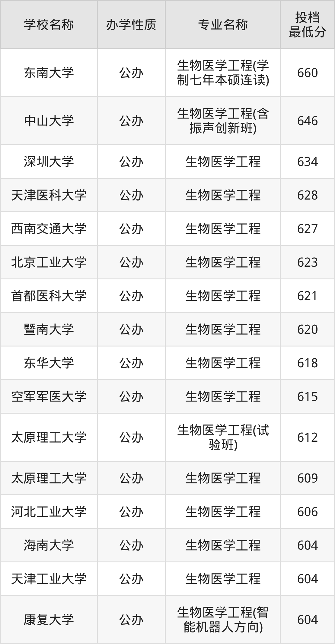 下面是全国各个大学生物医学工程专业最低录取分数线排名一览表,考生可根据自己的分数情况选择合适的学校报考。