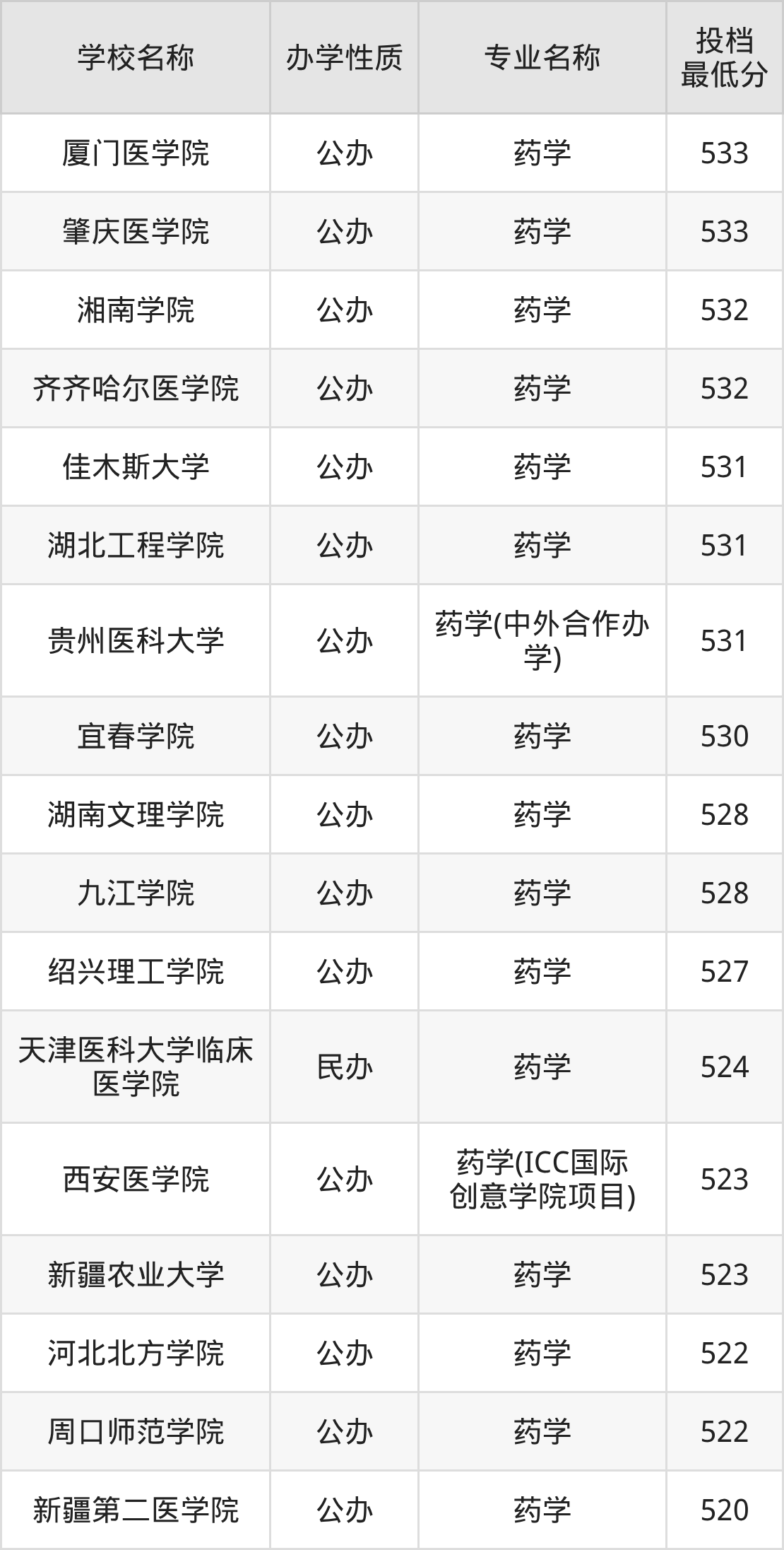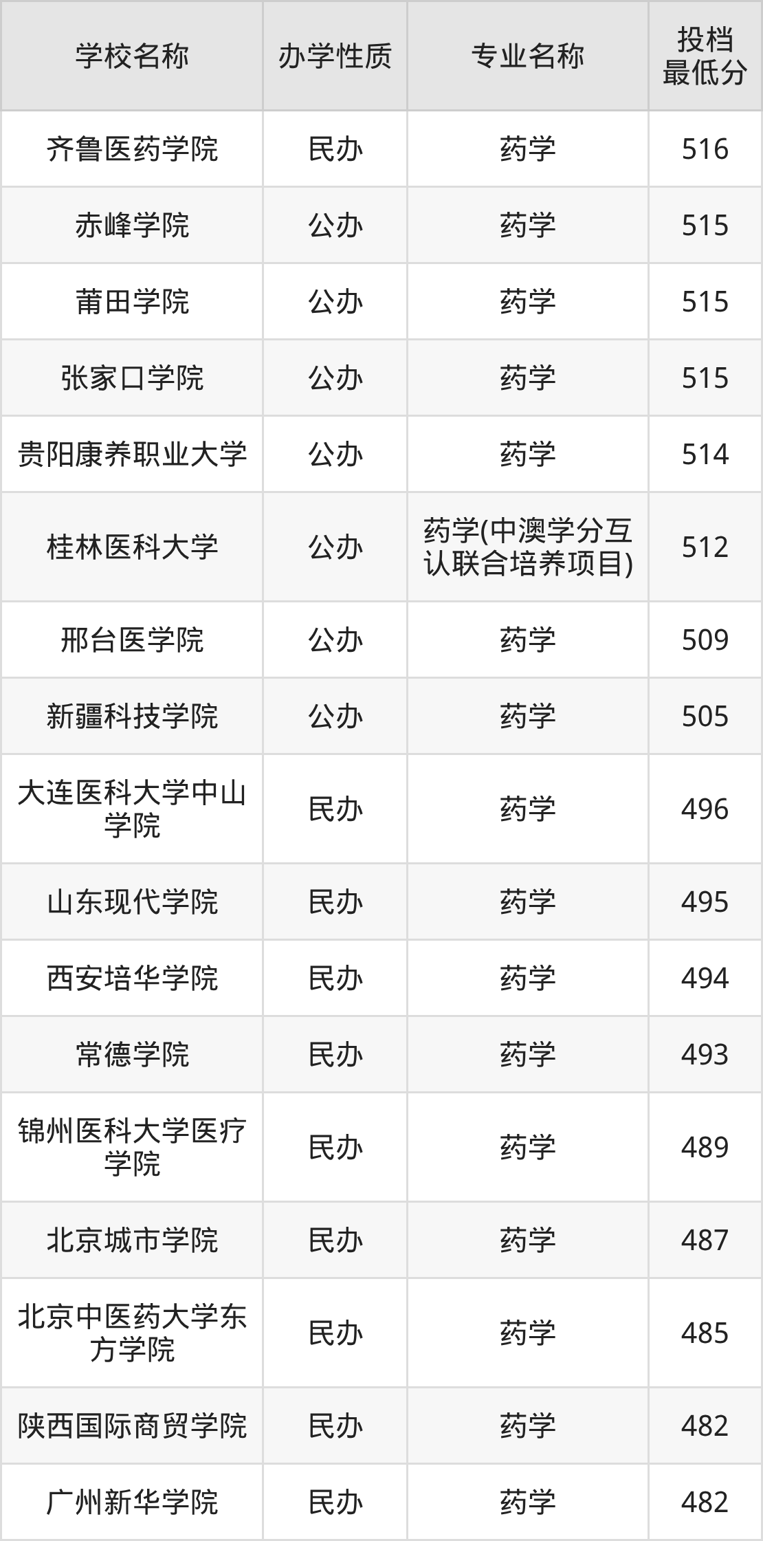 分数线最低、最好考的是海南科技职业大学,学校药学最低分是460,超本科线1分,不过这所学校是民办性质。2025公办大学最低分是505,收分最低的学校是新疆科技学院,超本科线46分能上。