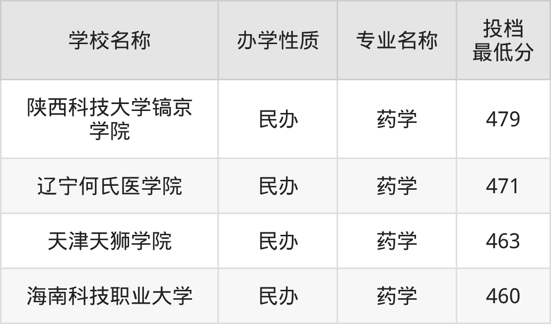 另外分数线比较低的大学还有天津天狮学院(463分)、辽宁何氏医学院(471分)、陕西科技大学镐京学院(479分)、广州新华学院(482分)、陕西国际商贸学院(482分)等。