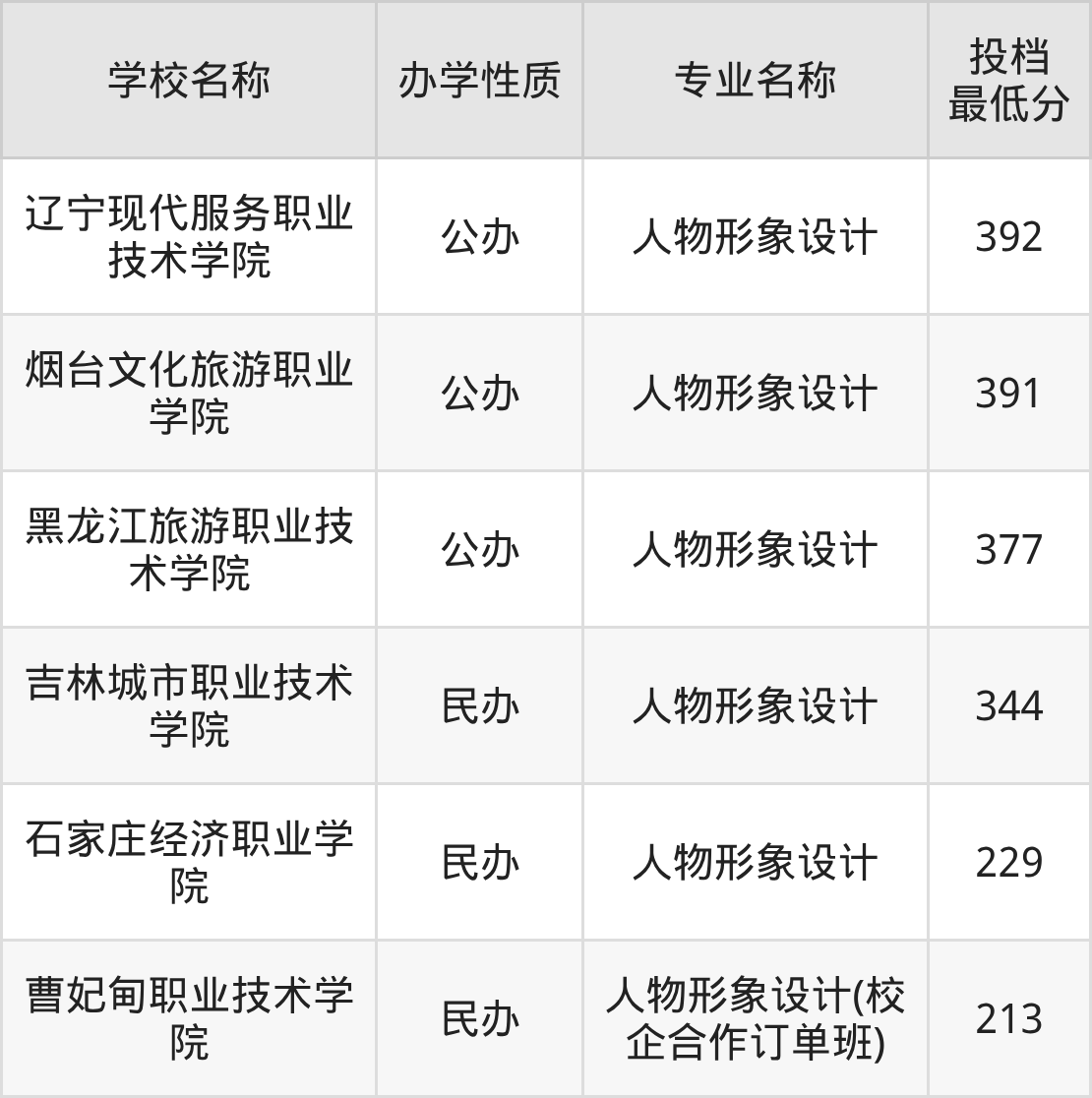 2025年人物形象设计专业最低录取分数线位于213分到392分之间,收分最低的大学是曹妃甸职业技术学院。各校最低分如下。