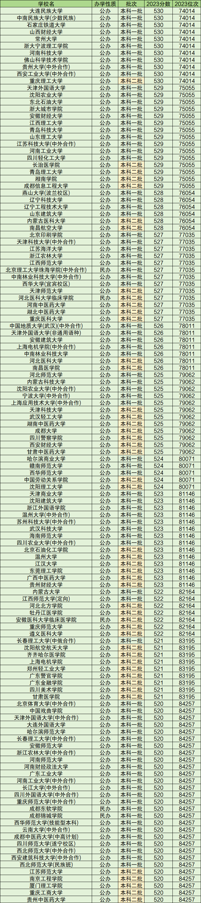 理科(520分-530分):中国地质大学、内蒙古大学、四川农业大学等。