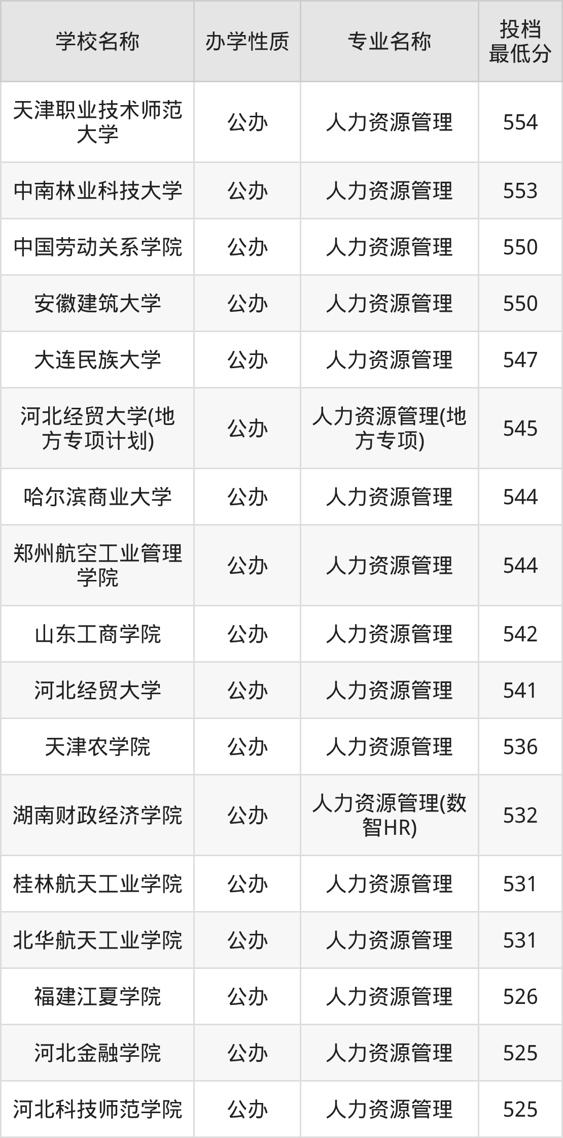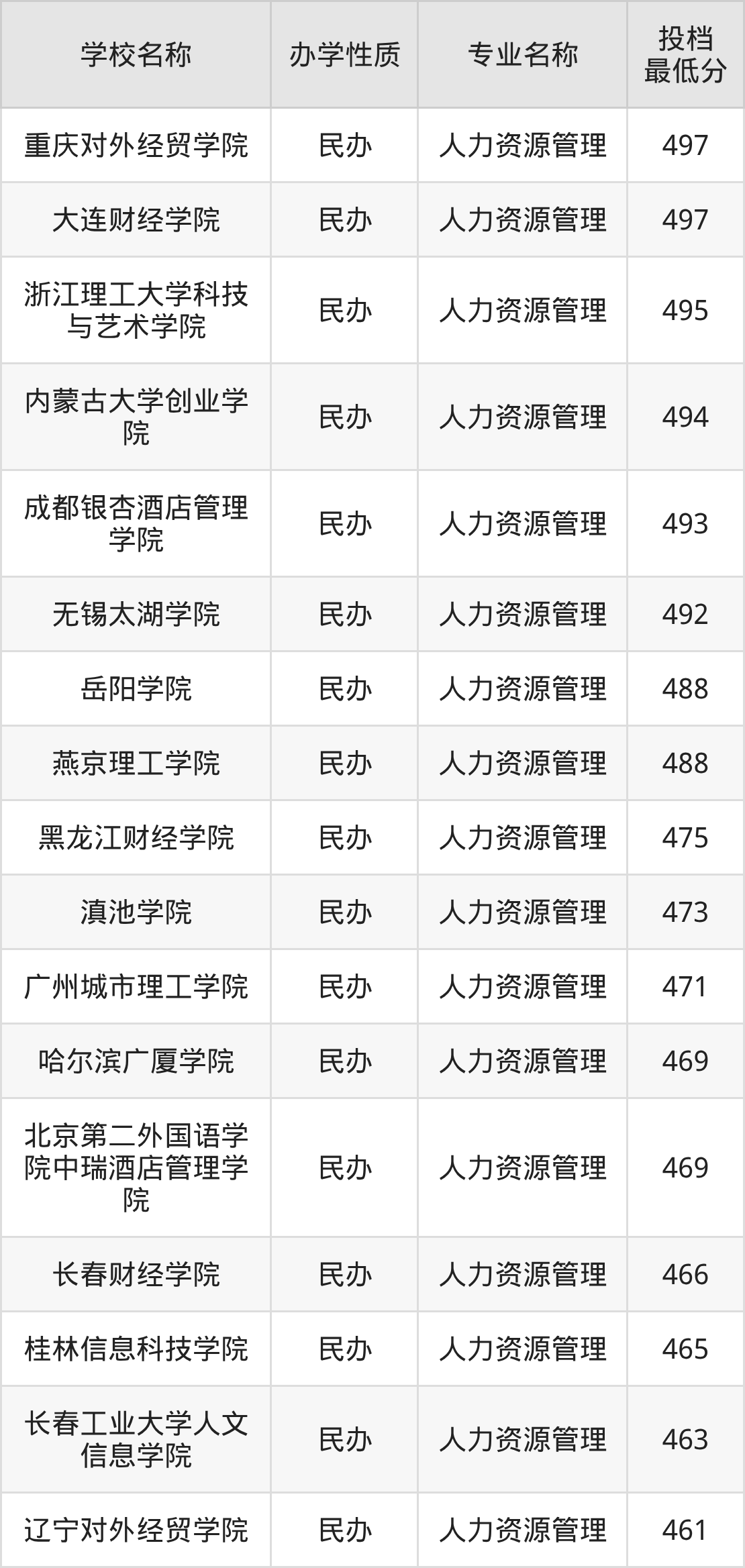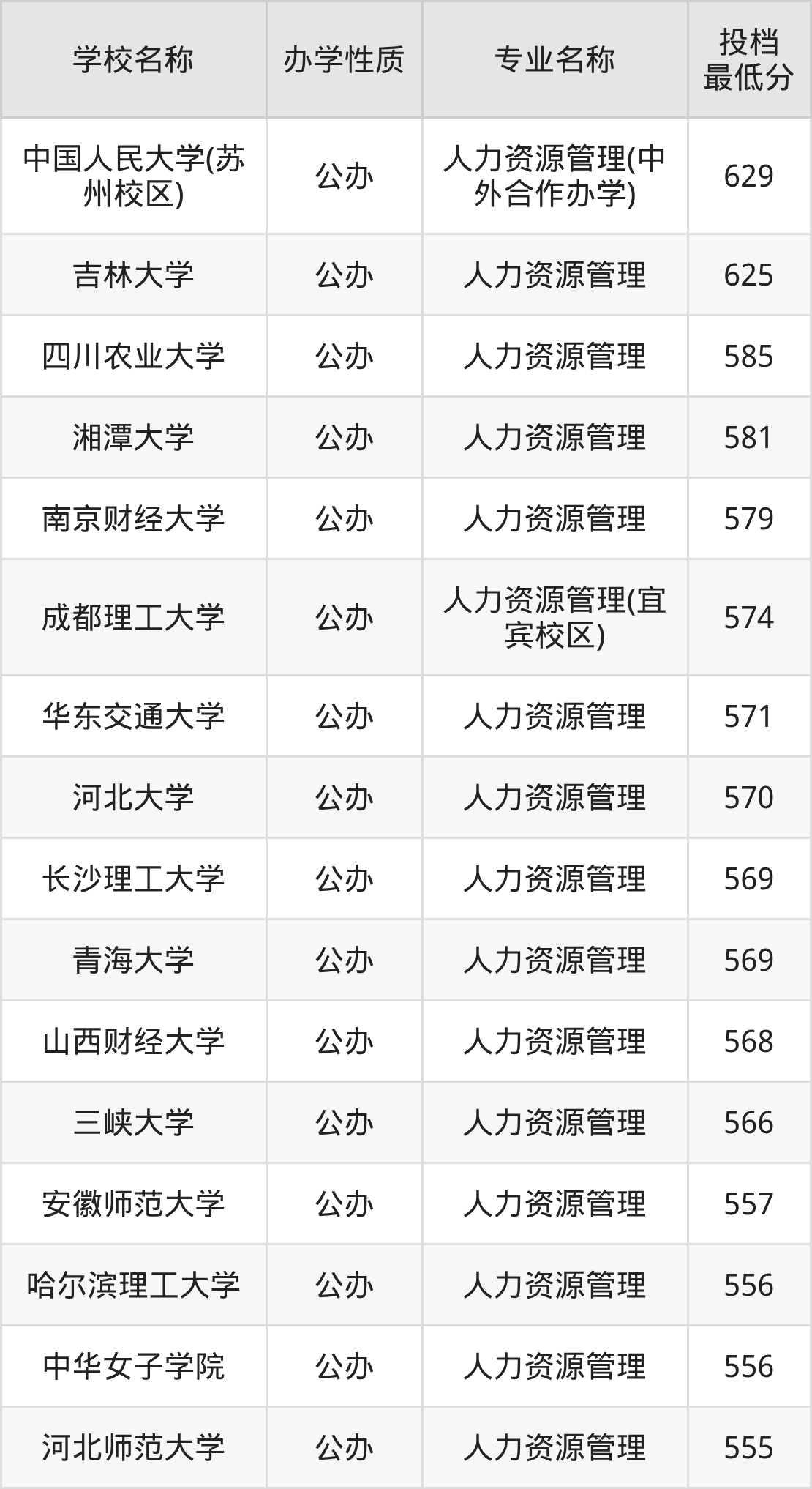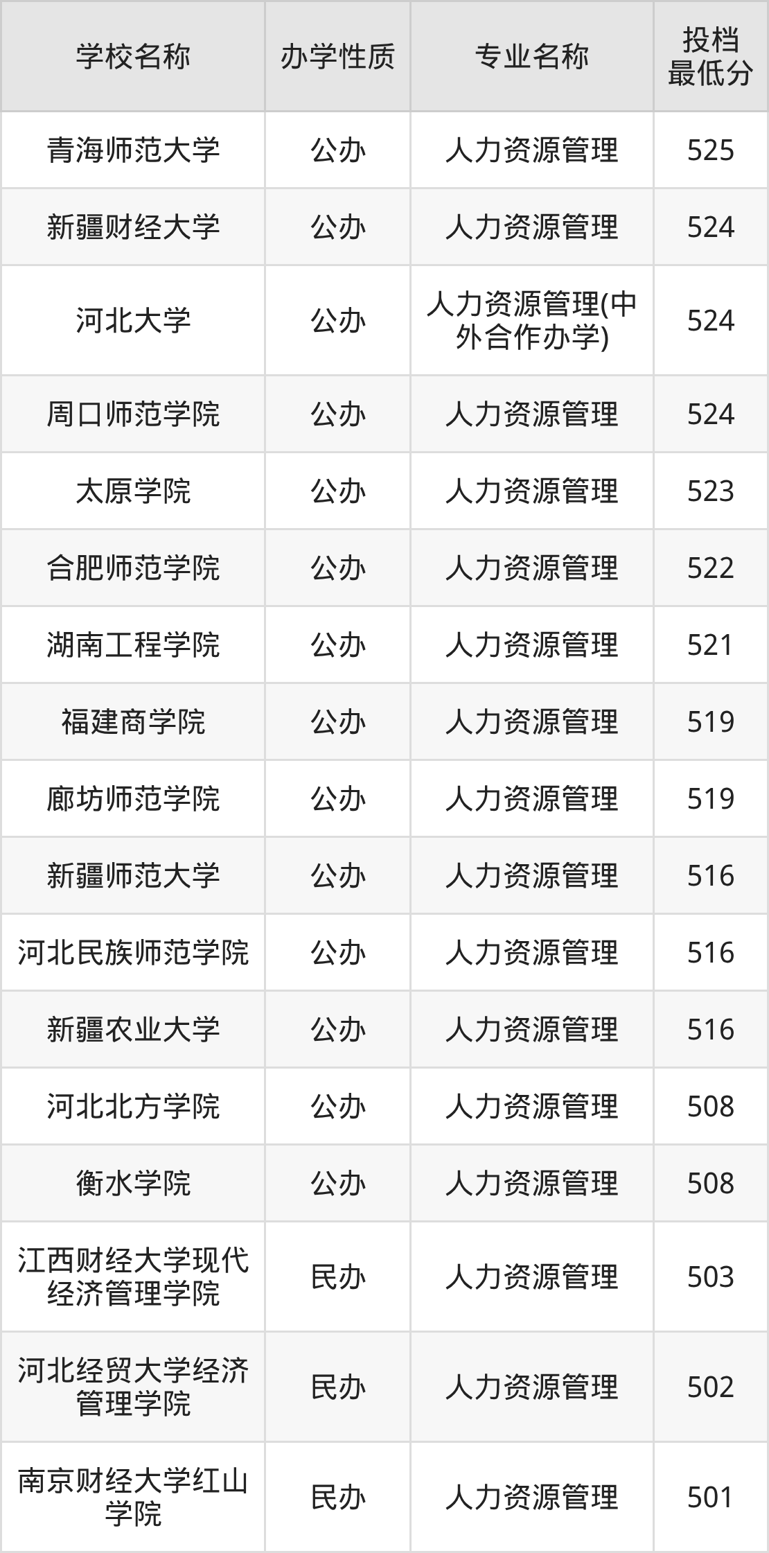 下面是全国各个大学人力资源管理专业最低录取分数线排名一览表,考生可根据自己的分数情况选择合适的学校报考。