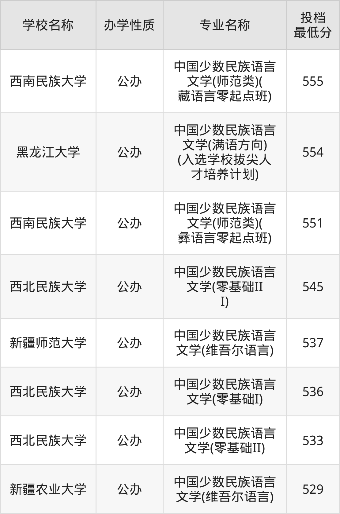 2025年全国中国少数民族语言文学专业录取分数线从529分到555分不等,各校最低分数线存在较大差异。