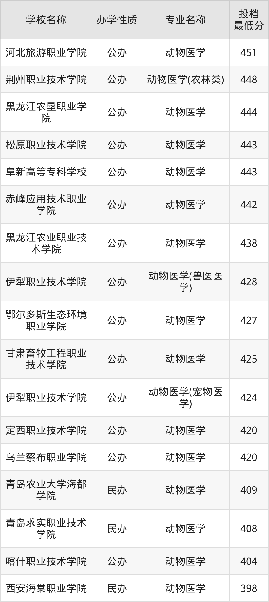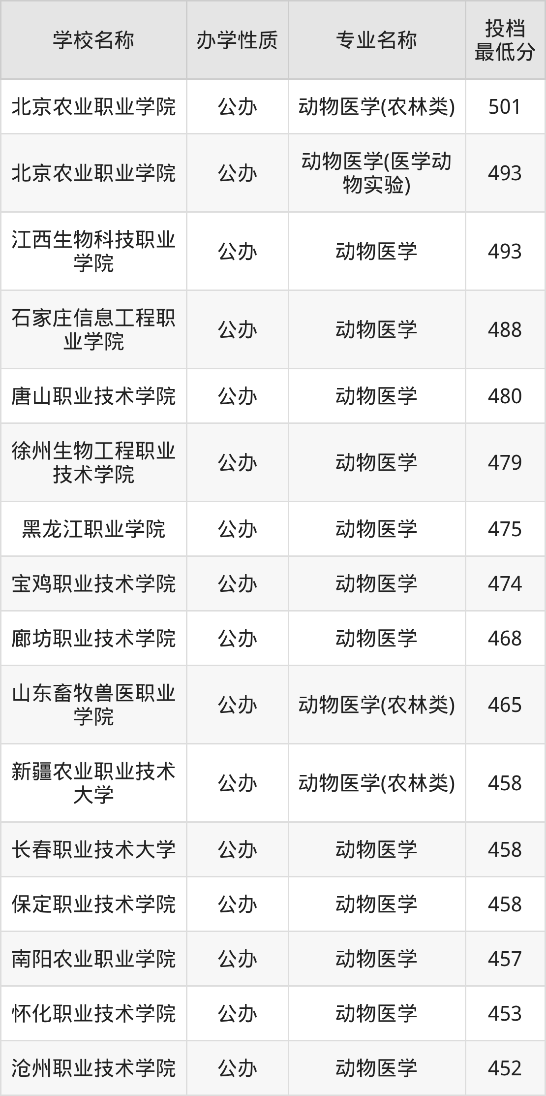 450分左右的动物医学大学有:廊坊职业技术学院468分、山东畜牧兽医职业学院465分、保定职业技术学院458分、新疆农业职业技术大学458分、长春职业技术大学458分。