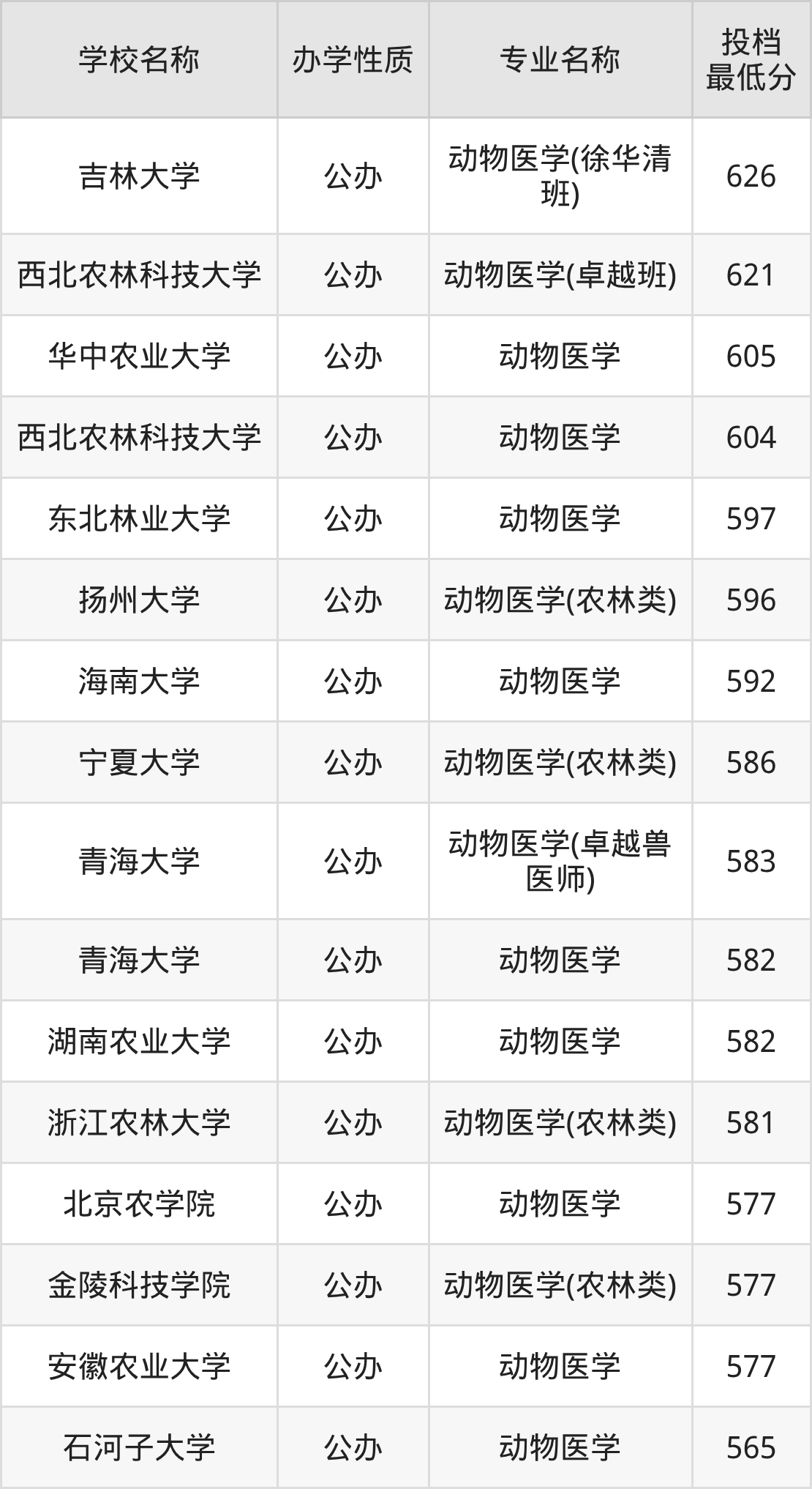 下面是全国各个大学动物医学专业最低录取分数线排名一览表,考生可根据自己的分数情况选择合适的学校报考。
