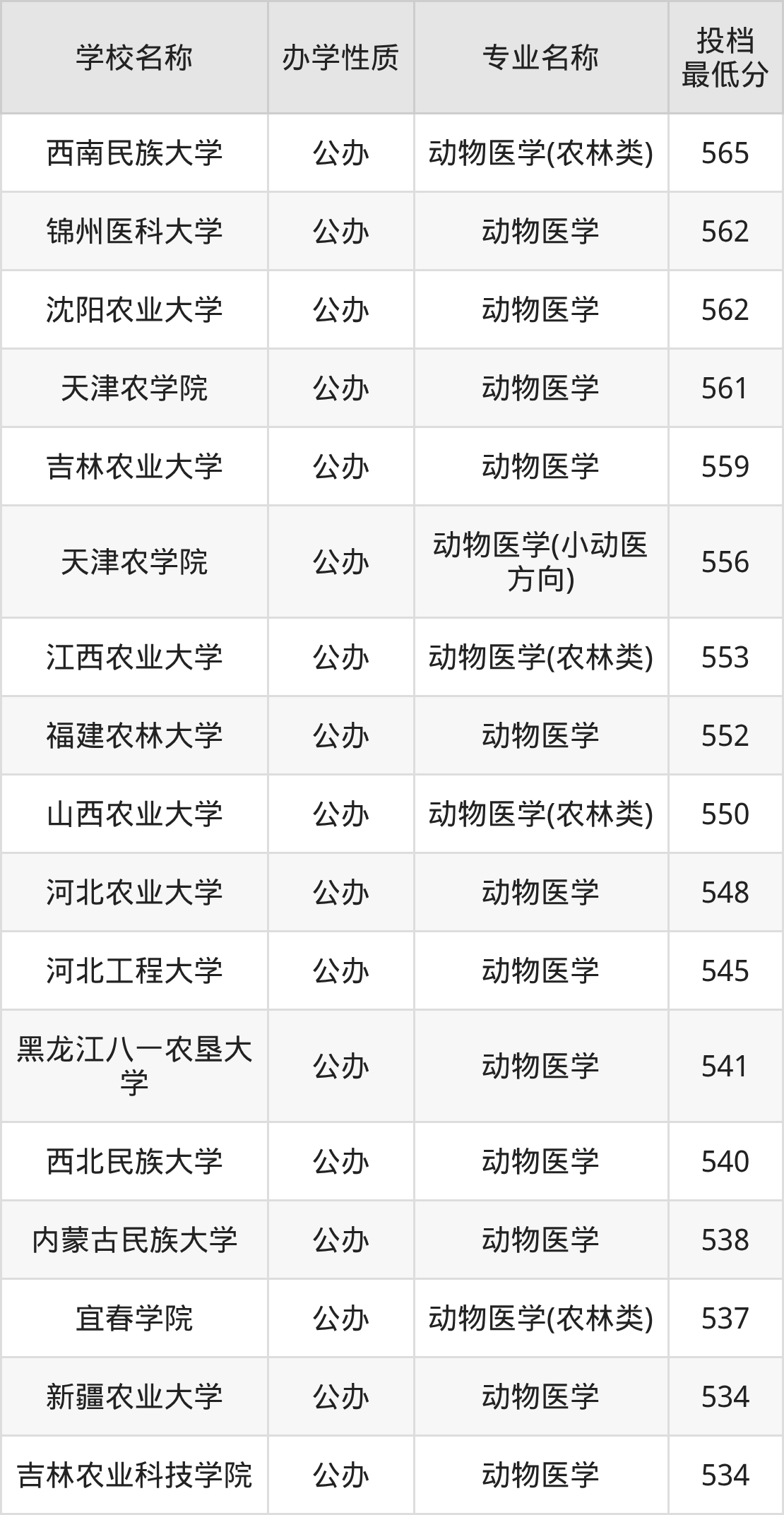 550分左右的动物医学大学有:石河子大学565分、西南民族大学565分、锦州医科大学562分、沈阳农业大学562分、天津农学院561分。