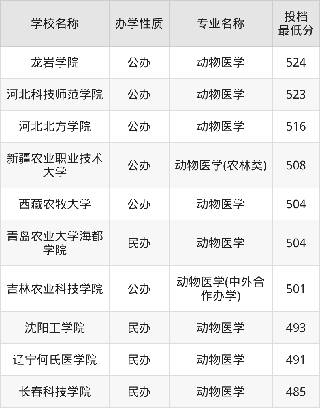 分数线最低、最好考的是长春科技学院,学校动物医学最低分是485,超本科线26分,不过这所学校是民办性质。2025公办大学最低分是501,收分最低的学校是吉林农业科技学院,超本科线42分能上。