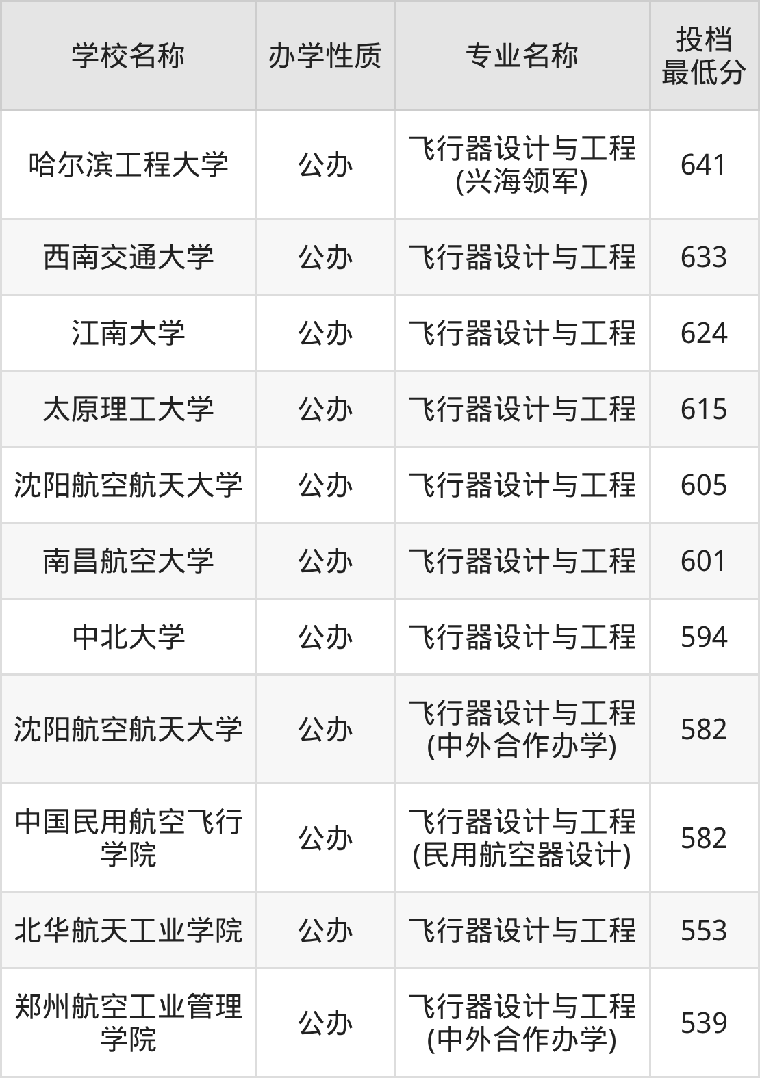 600分左右的飞行器设计与工程大学:南昌航空大学601分、沈阳航空航天大学605分、太原理工大学615分、江南大学624分、西南交通大学633分等;