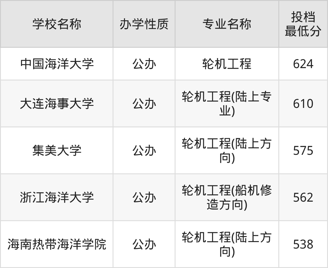 轮机工程专业收分最高的大学是中国海洋大学,2025年最低分624分,超本科线165分。分数线排名前五的大学还有:大连海事大学(陆上专业)610分、集美大学(陆上方向)575分、浙江海洋大学(船机修造方向)562分、海南热带海洋学院(陆上方向)538分。