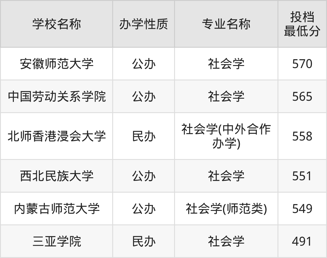 500分左右的社会学大学:内蒙古师范大学549分(师范类)、西北民族大学551分、北师香港浸会大学558分(中外合作办学)、中国劳动关系学院565分、安徽师范大学570分等;