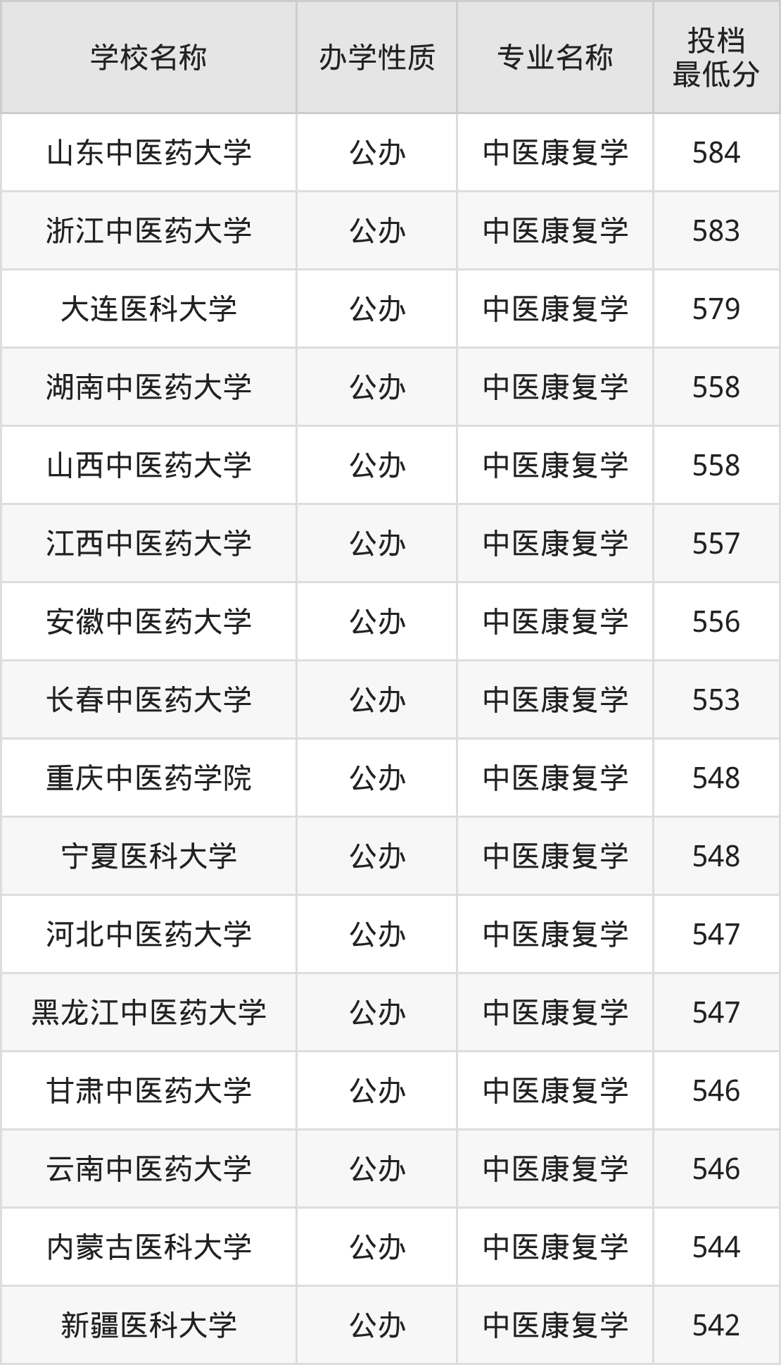 中医康复学专业收分最高的大学是山东中医药大学,2025年最低分584分,超本科线125分。分数线排名前五的大学还有:浙江中医药大学583分、大连医科大学579分、湖南中医药大学558分、山西中医药大学558分。