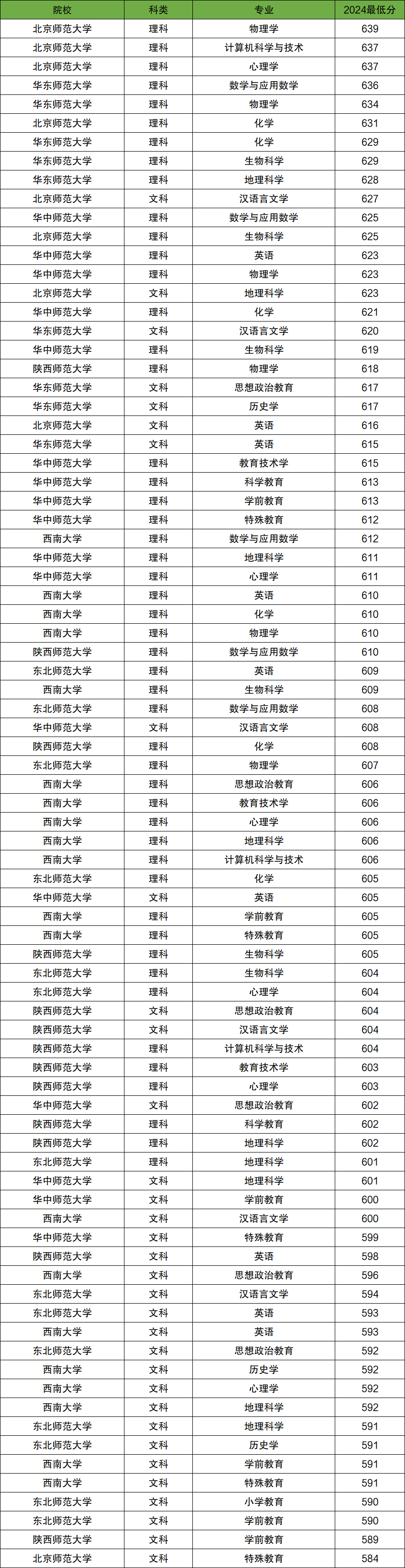 有东北师范大学(文科最低590分)、华中师范大学(文科最低599分)、北京师范大学(理科最低625分)、华东师范大学(文科最低615分)、西南大学(文科最低591分)等。
