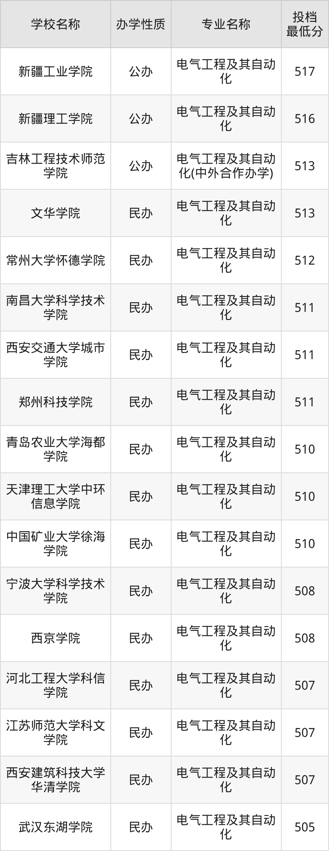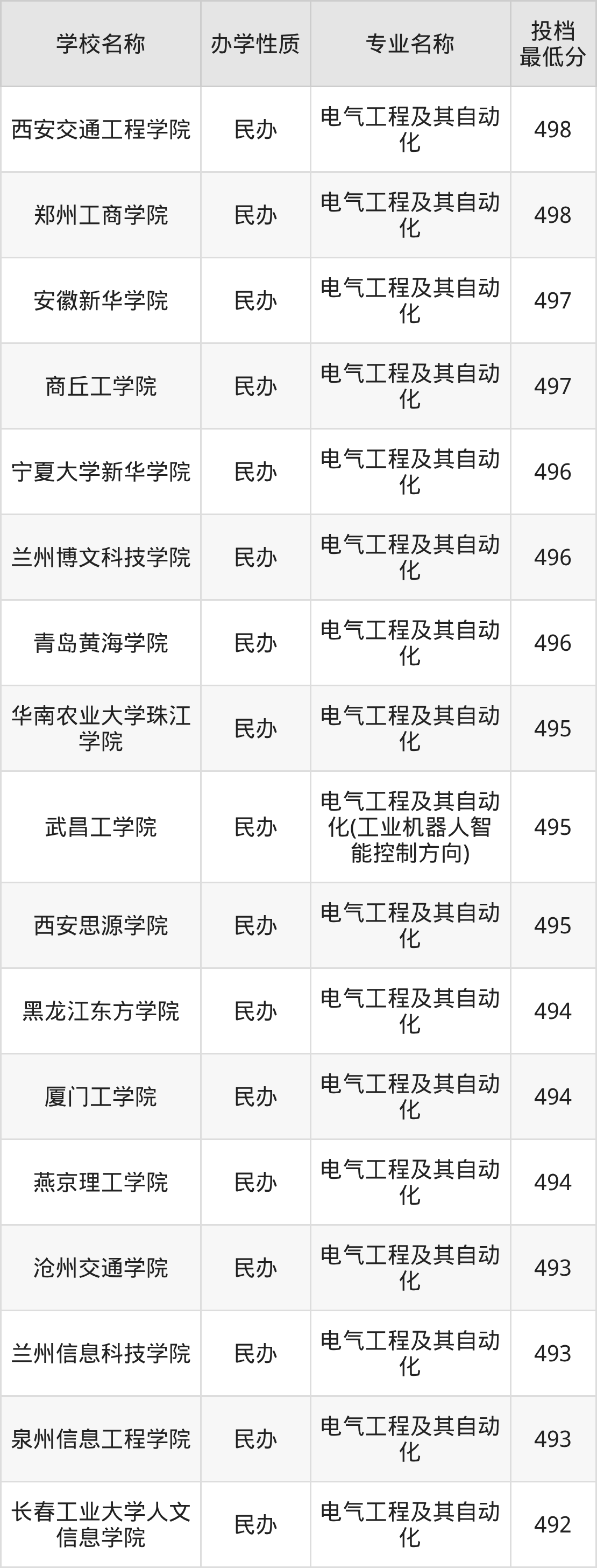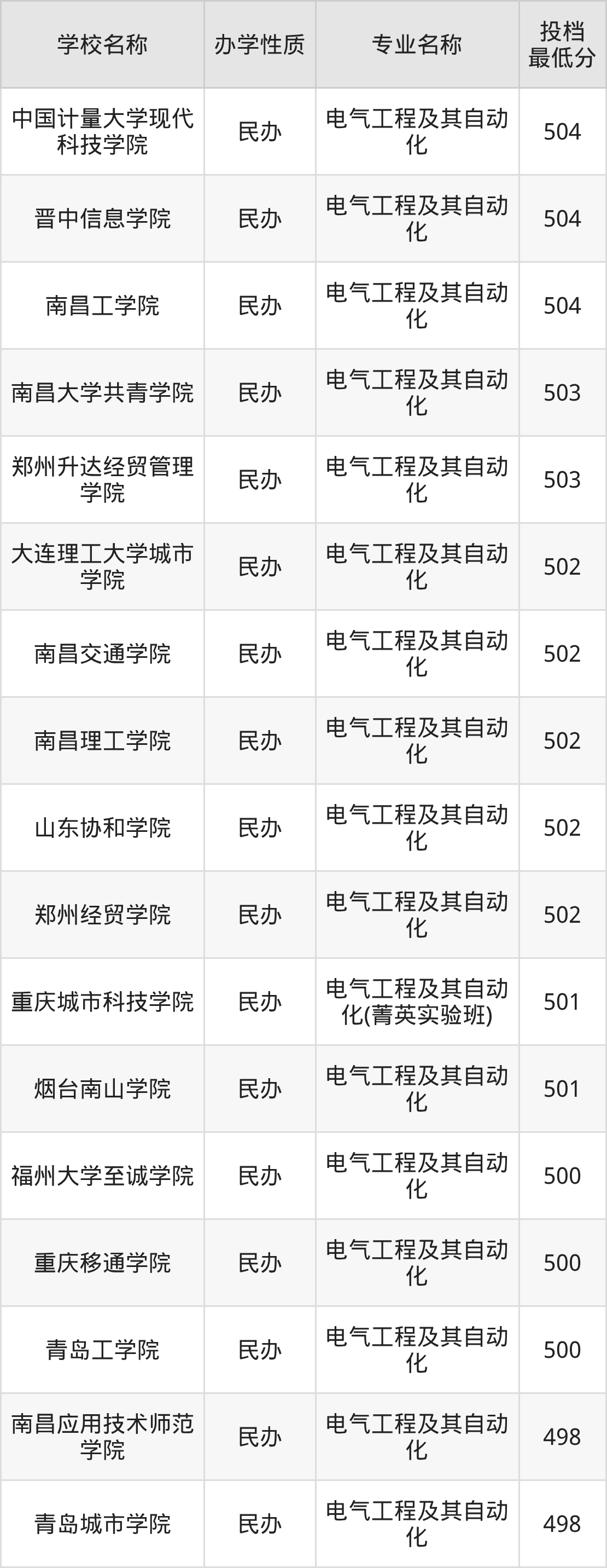 500分左右的电气工程及其自动化大学:烟台南山学院501分、重庆城市科技学院501分(菁英实验班)、郑州经贸学院502分、山东协和学院502分、南昌理工学院502分等;