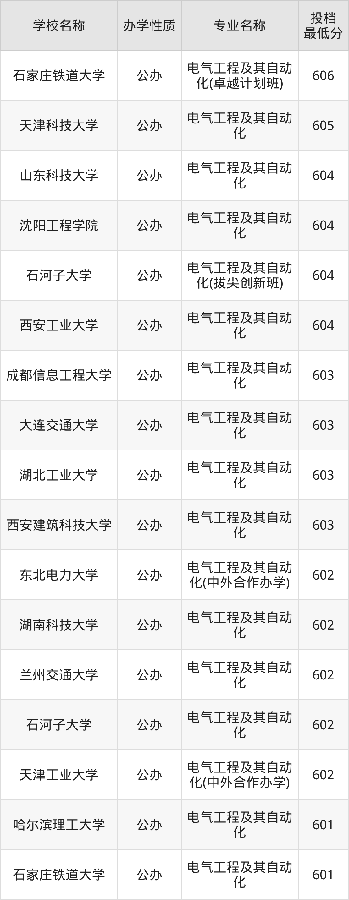 600分左右的电气工程及其自动化大学:武汉工程大学601分、石家庄铁道大学601分、哈尔滨理工大学601分、天津工业大学602分(中外合作办学)、石河子大学602分等;