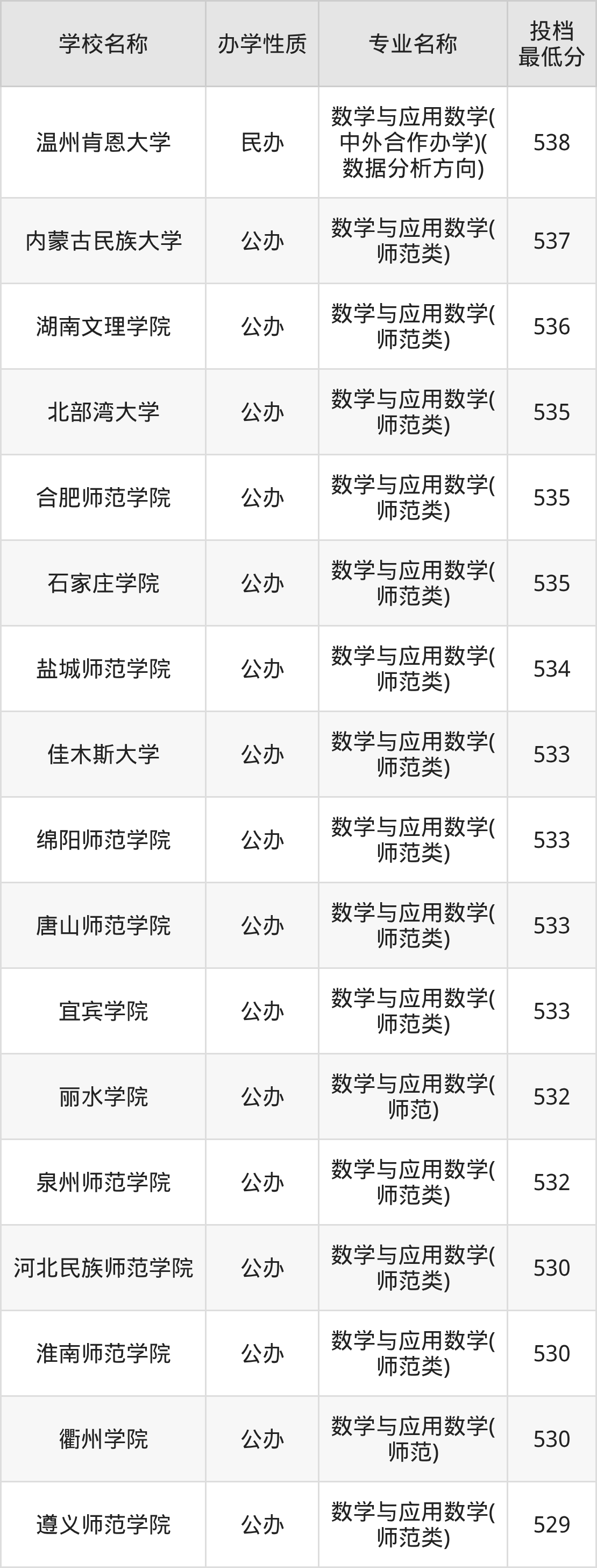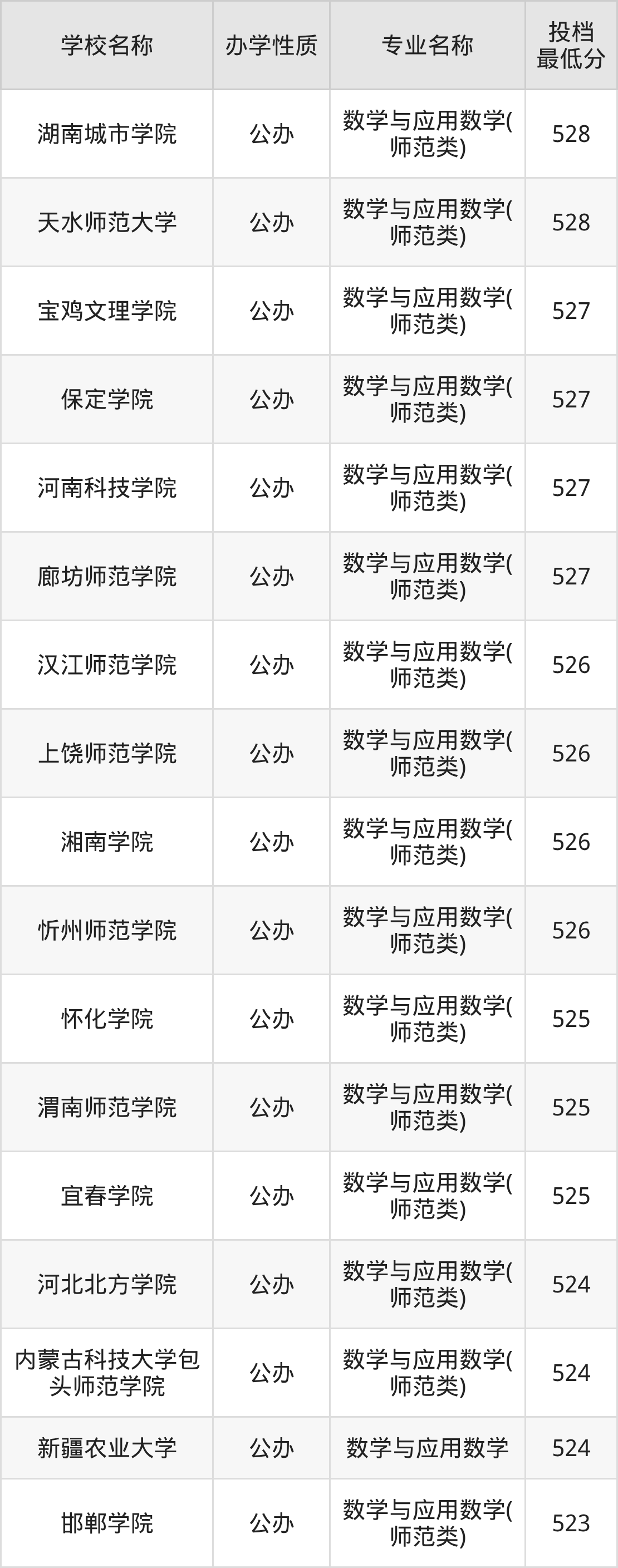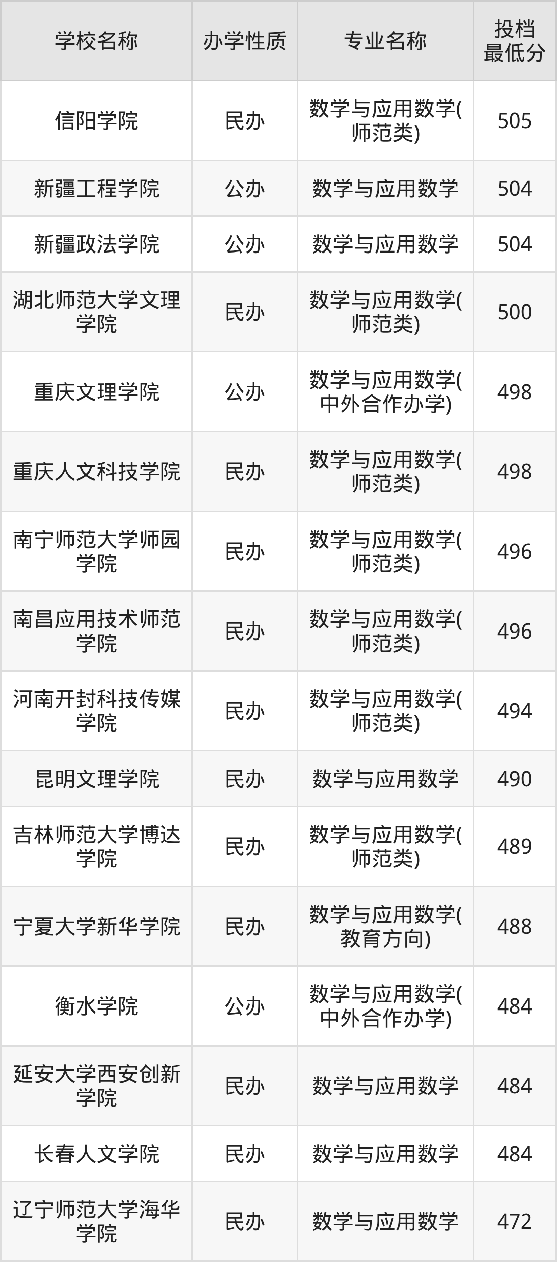 500分左右的数学与应用数学大学:新疆政法学院504分、新疆工程学院504分、信阳学院505分(师范类)、赣南师范大学科技学院505分(师范类)、呼伦贝尔学院505分(师范类)等;