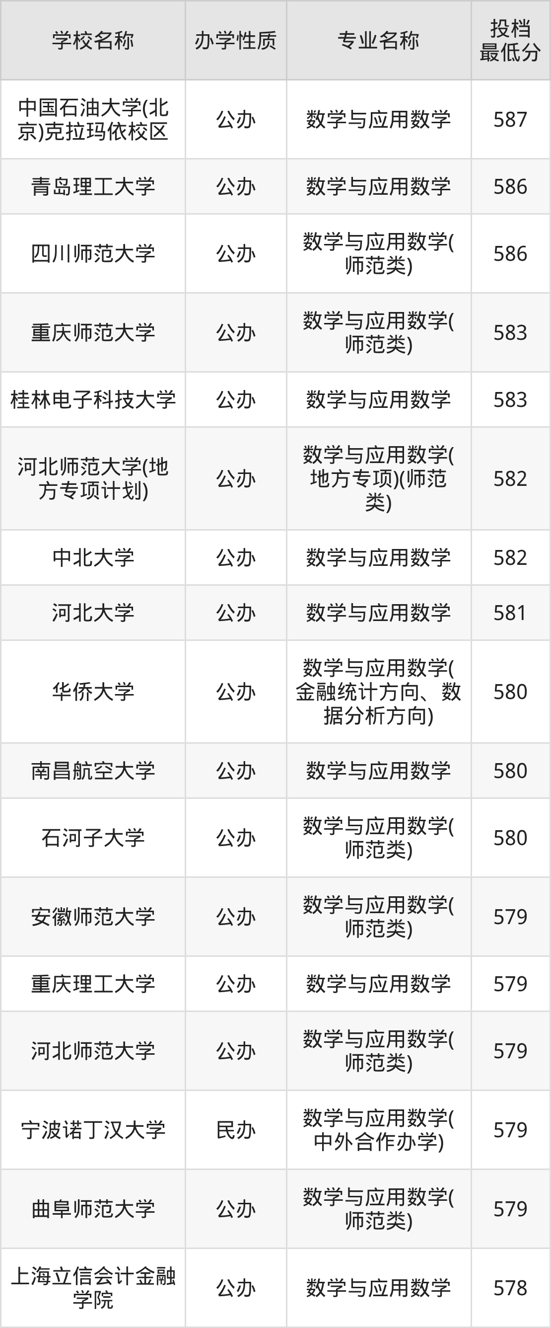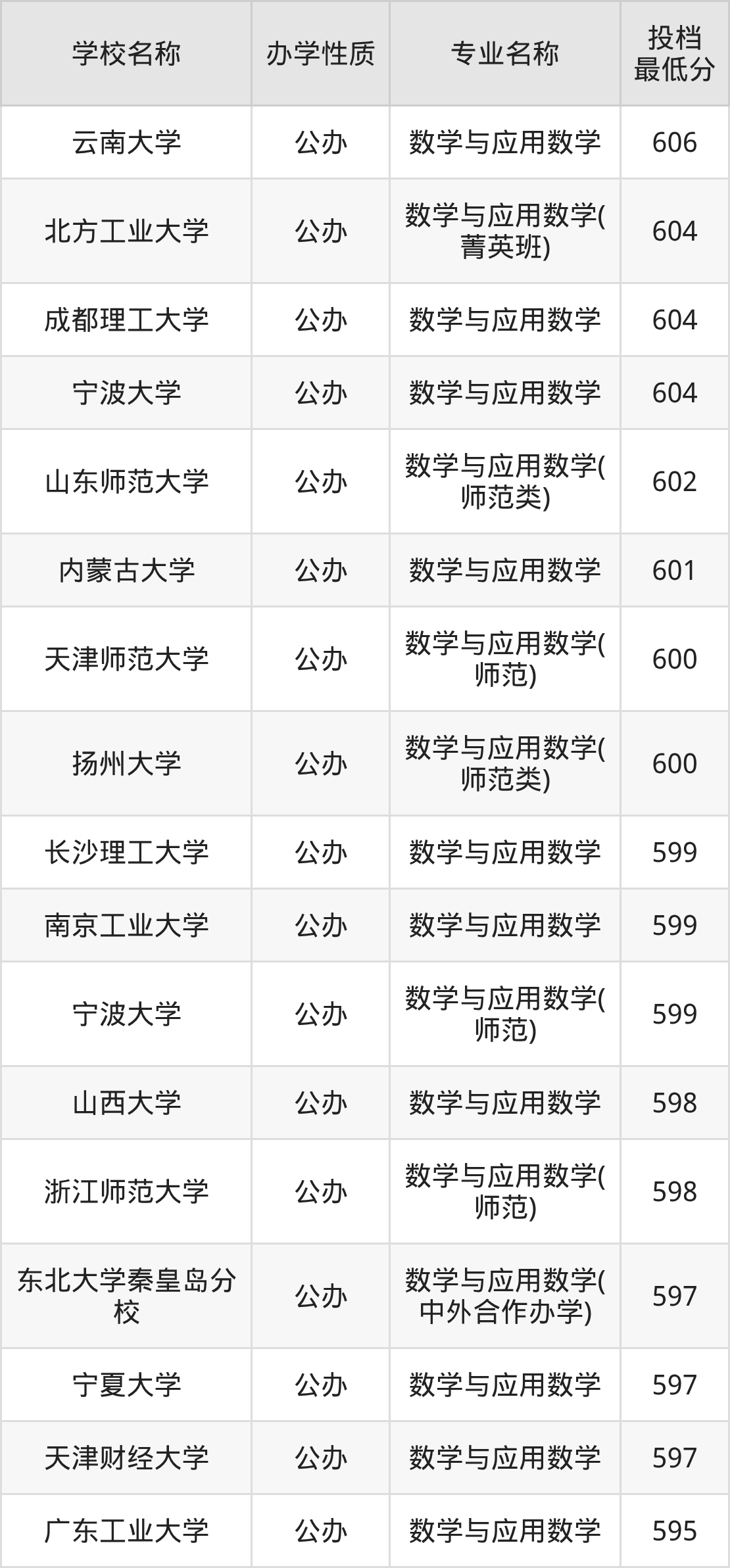 600分左右的数学与应用数学大学:内蒙古大学601分、山东师范大学602分(师范类)、宁波大学604分、成都理工大学604分、北方工业大学604分(菁英班)等;