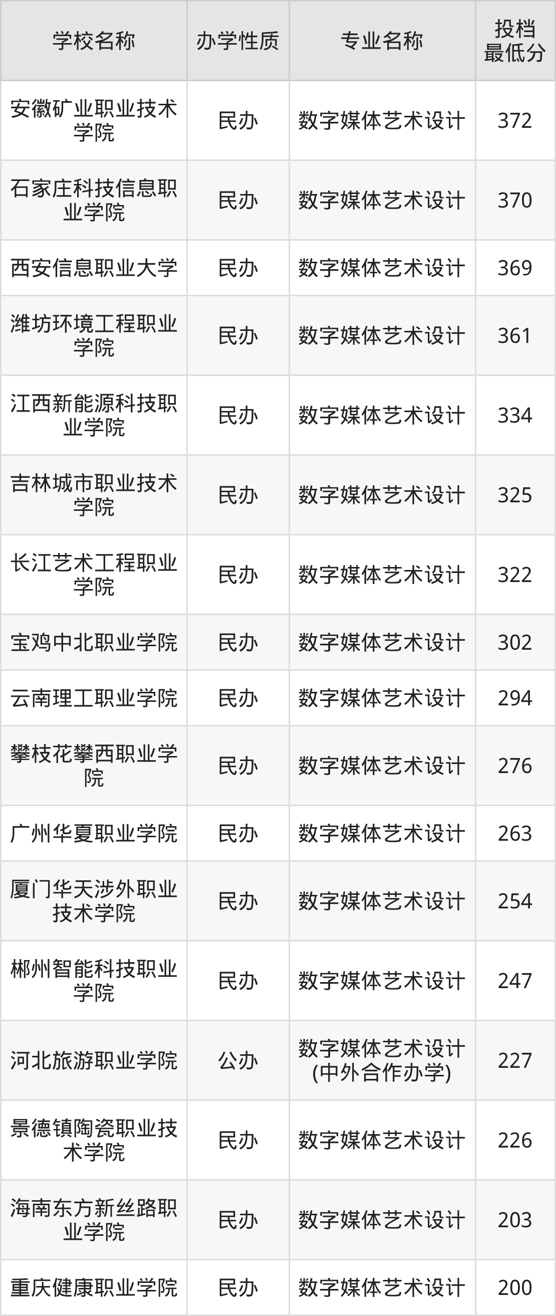 2025年数字媒体艺术设计专业最低录取分数线位于200分到466分之间,收分最低的大学是重庆健康职业学院。各校最低分如下。