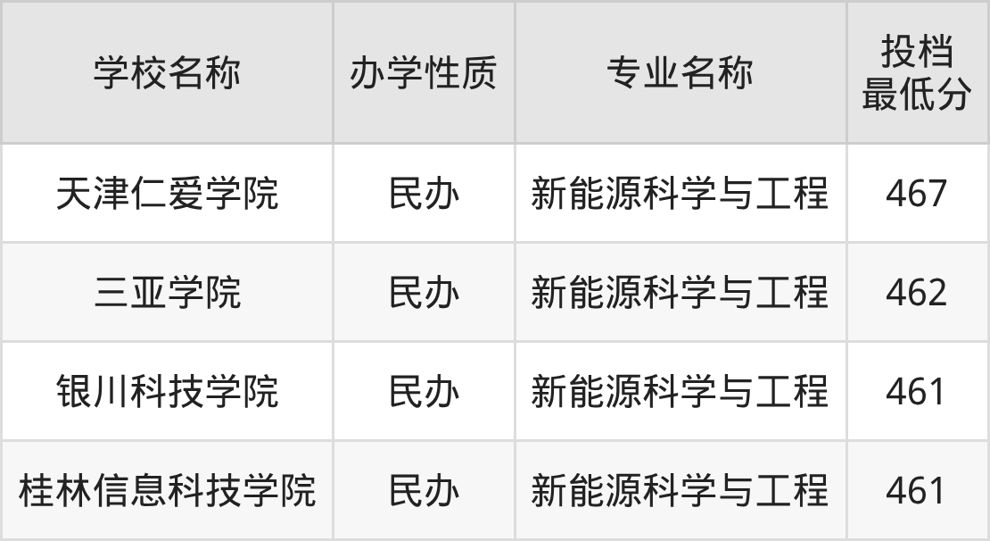 2025年新能源科学与工程专业最低录取分数线是461分,超本科分数线(459分)2分。也就是说想报考新能源科学与工程专业的同学,至少得超过本科线2分及以上。新能源科学与工程专业最低分的大学是桂林信息科技学院,不过该校属于民办。