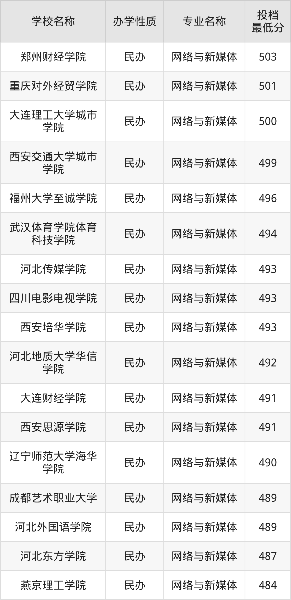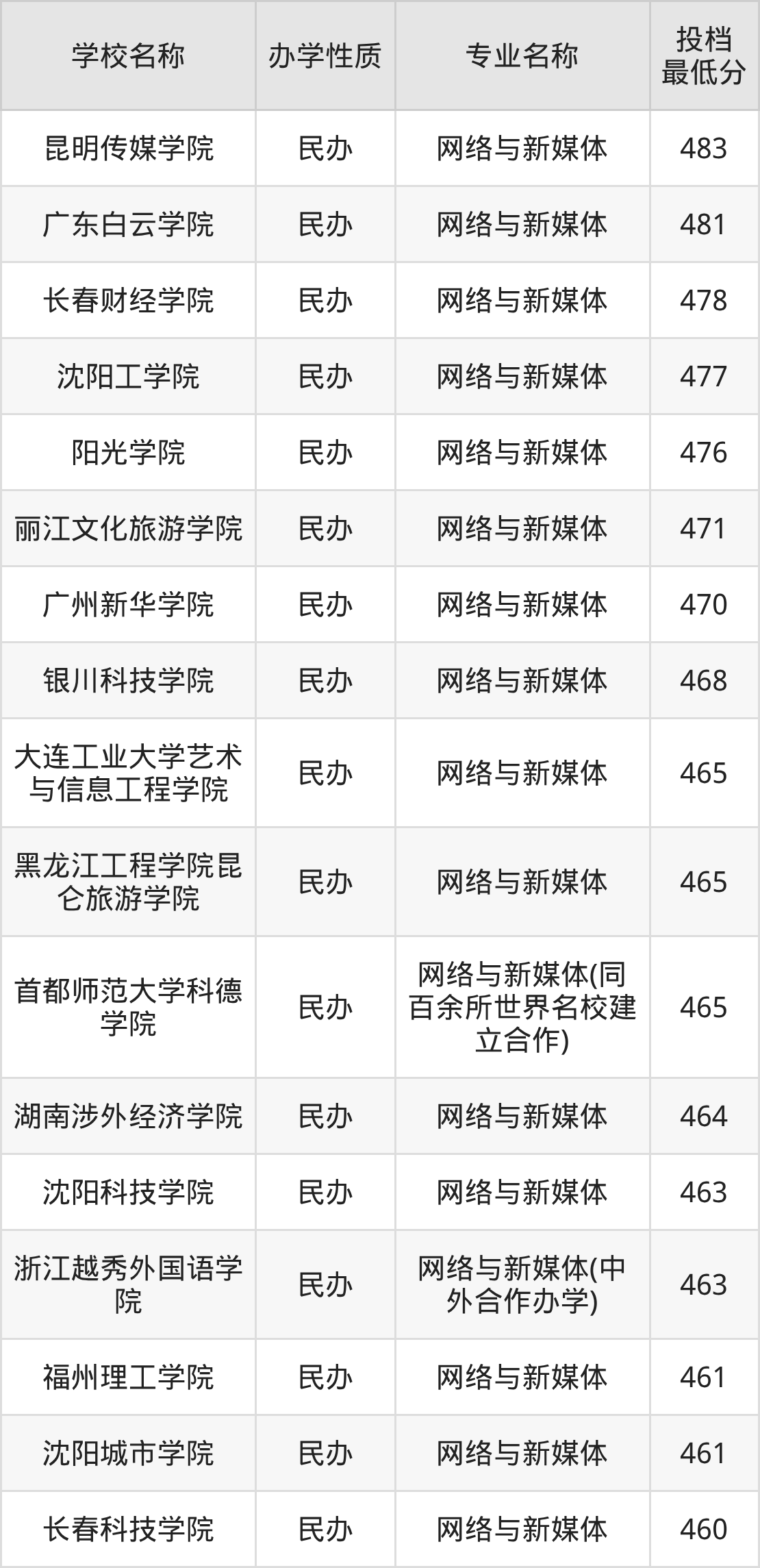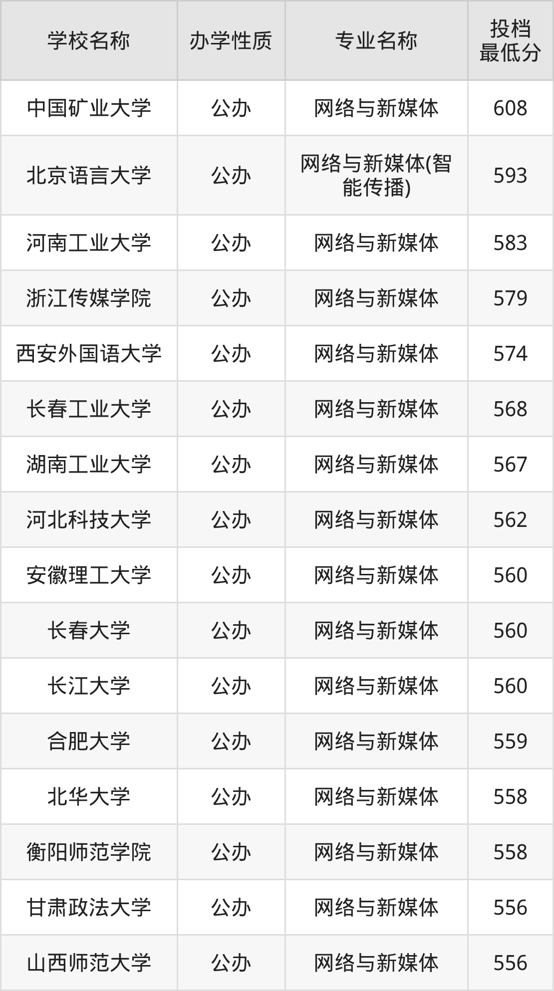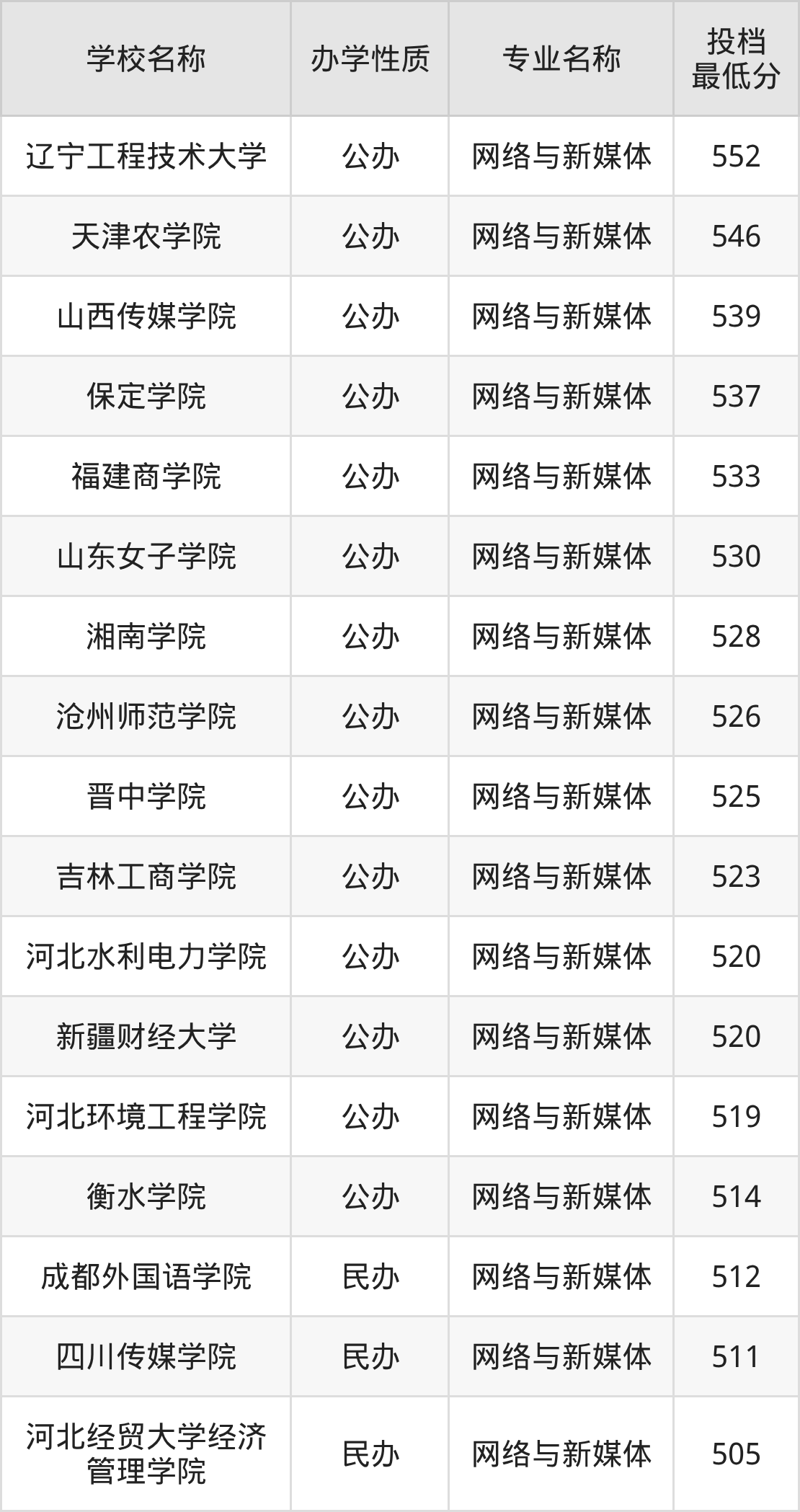 下面是2025年全国所有大学网络与新媒体专业录取分数线一览表(按照分数线从高到低排名):