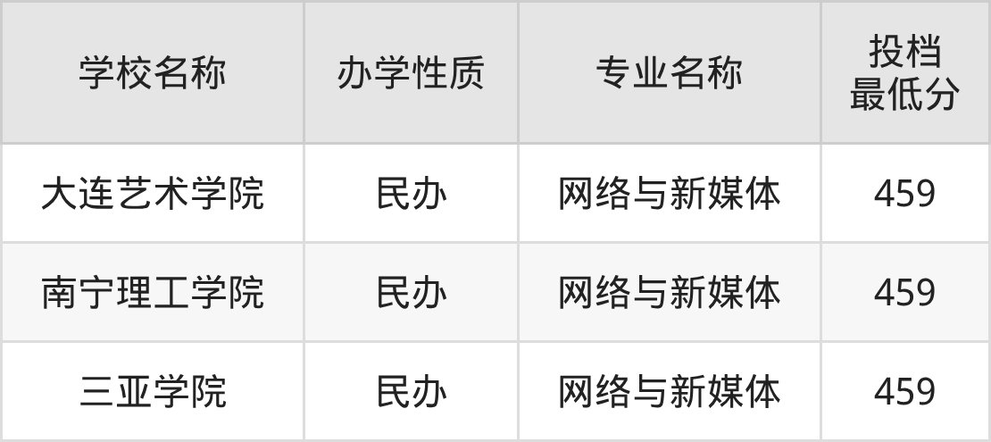 2025年网络与新媒体专业最低录取分数线是459分,刚好在本科分数线(459分)处。也就是说想报考网络与新媒体专业的同学,至少得达到本科线459分及以上。网络与新媒体专业最低分的大学是三亚学院,不过该校属于民办。