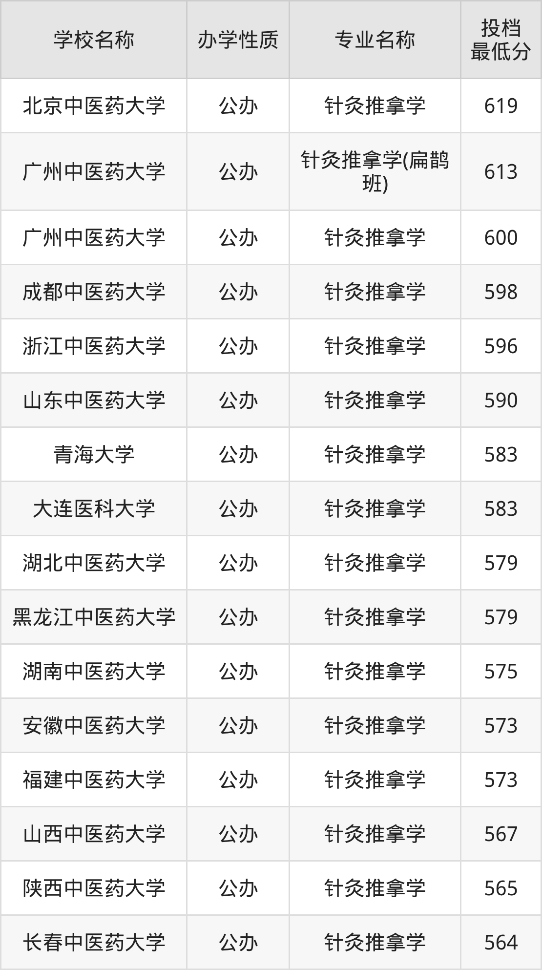下面是2025年全国所有大学针灸推拿学专业录取分数线一览表(按照分数线从高到低排名):