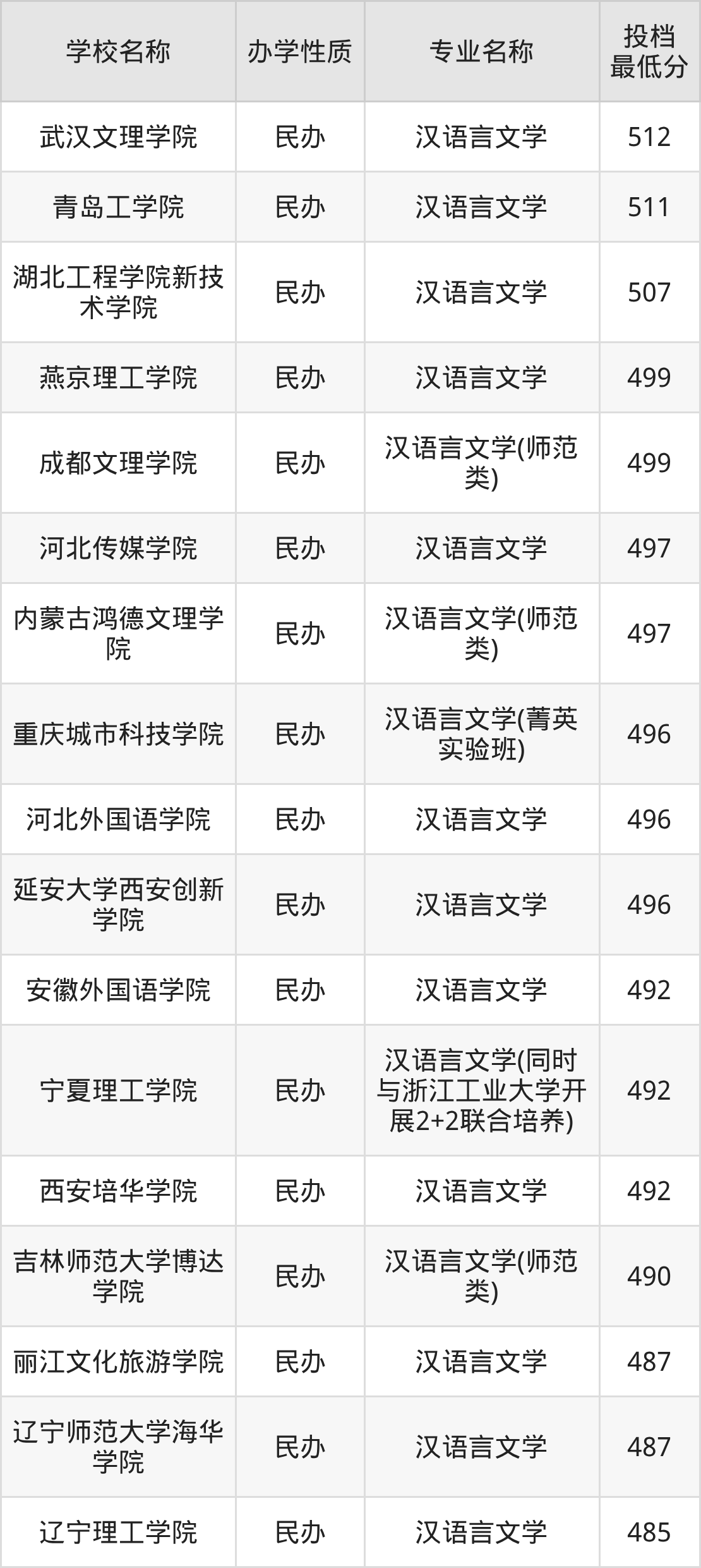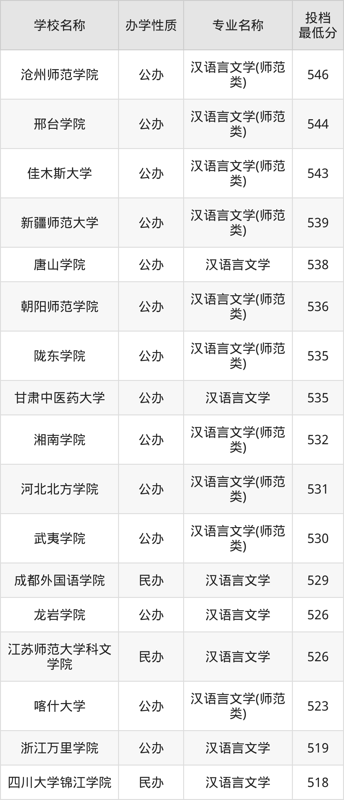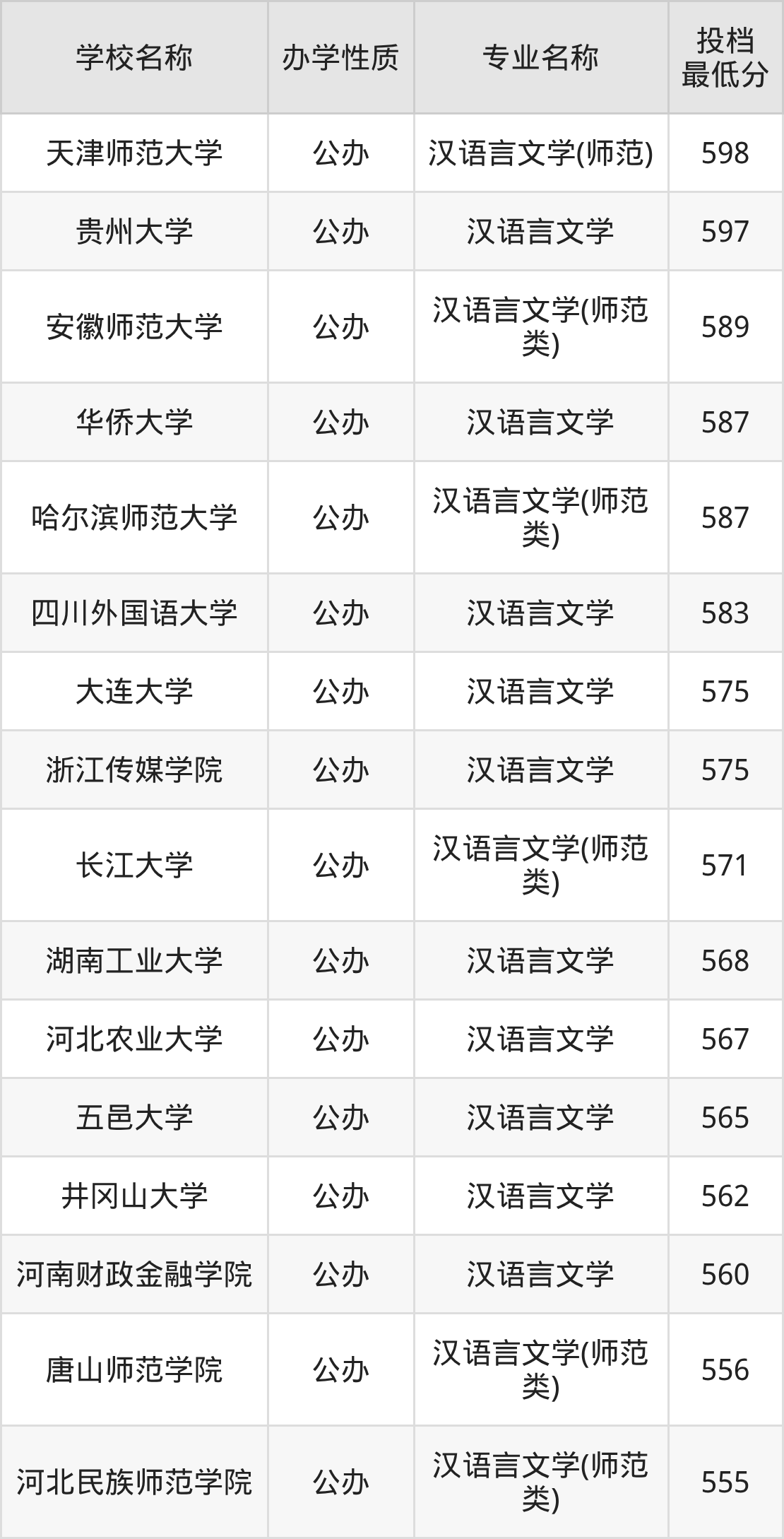 二、全国汉语言文学录取分数线排名表