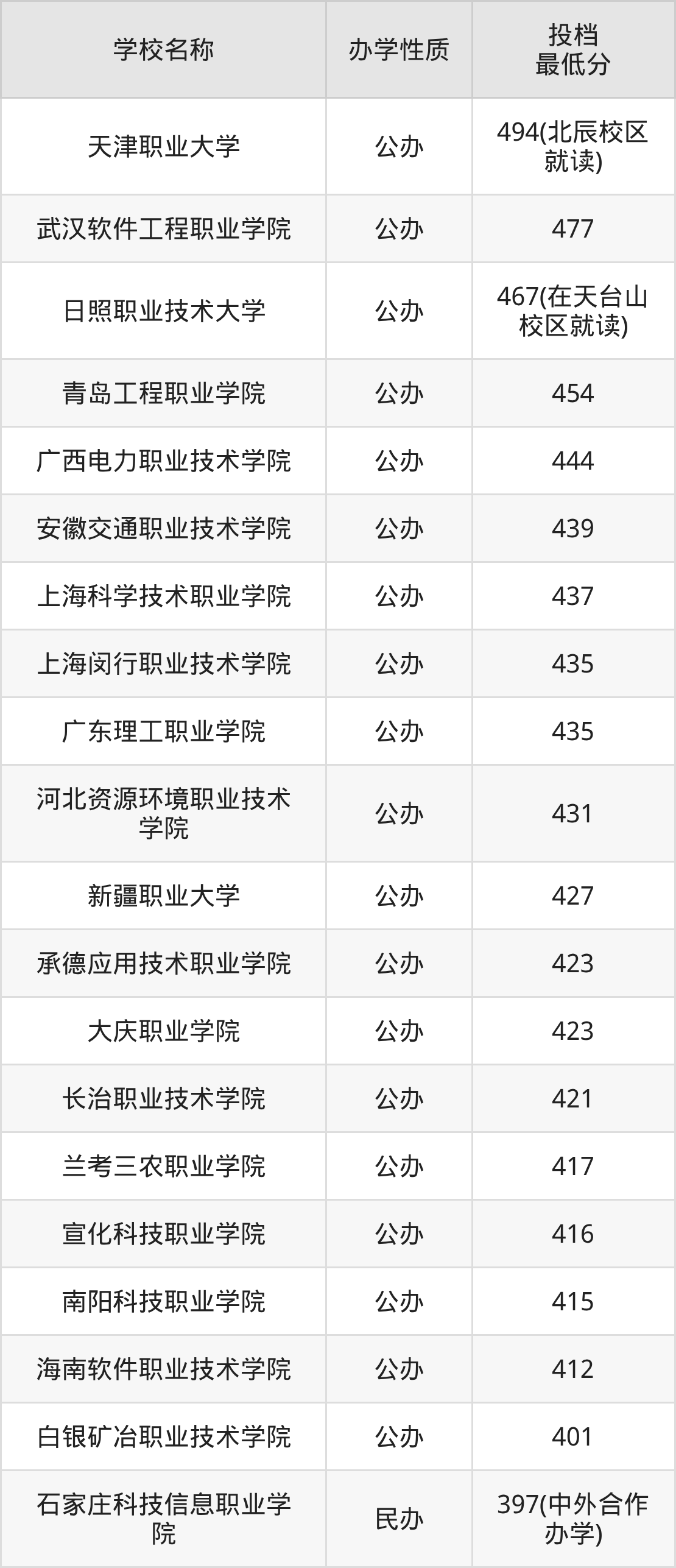 分数线第一名是:天津职业大学(北辰校区就读),494分。