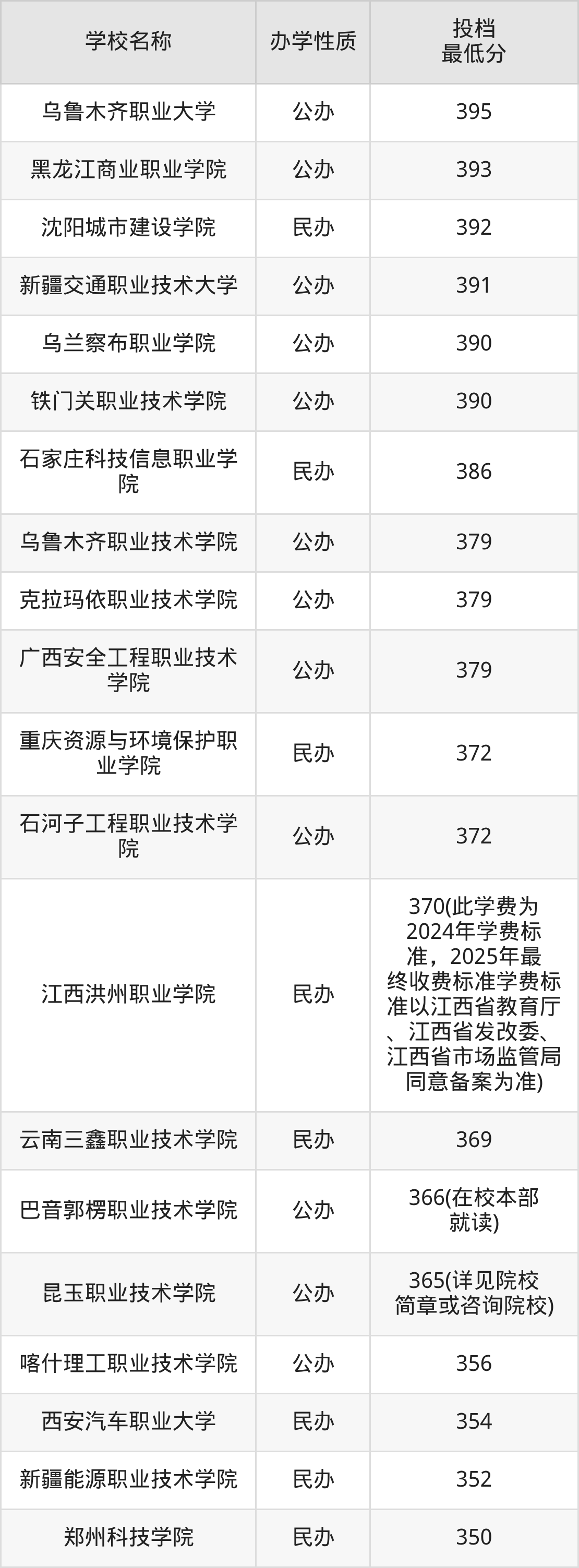 另外分数线比较低的大学还有邢台应用技术职业学院(201分)、邢台新能源职业学院(209分)、长春数字科技职业学院(223分)、云南商务职业学院(226分)、长江艺术工程职业学院(227分)等。