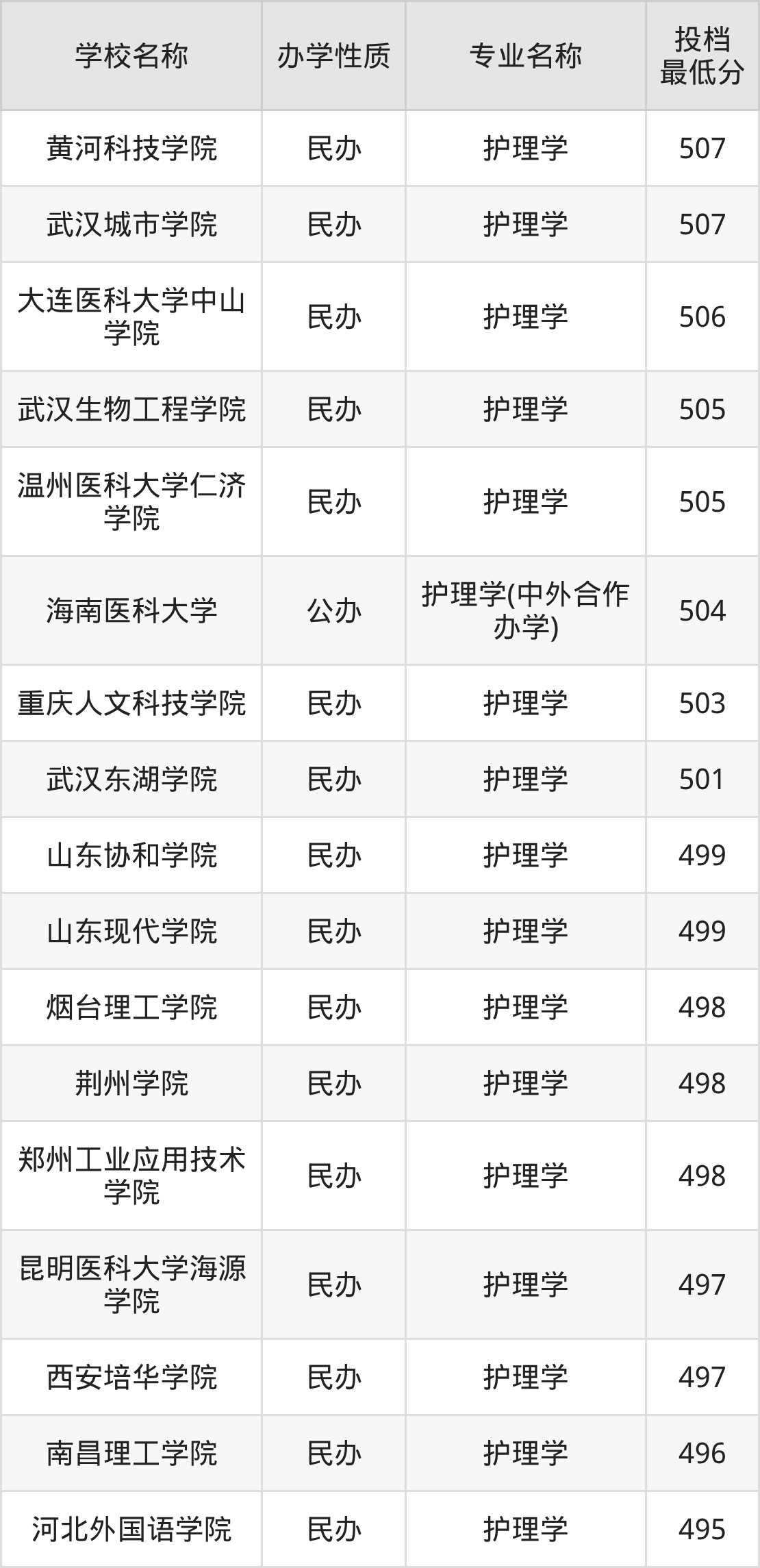 分数线最低、最好考的是三亚学院,学校护理学最低分是459,超本科线0分,不过这所学校是民办性质。2025公办大学最低分是504,收分最低的学校是海南医科大学,超本科线45分能上。