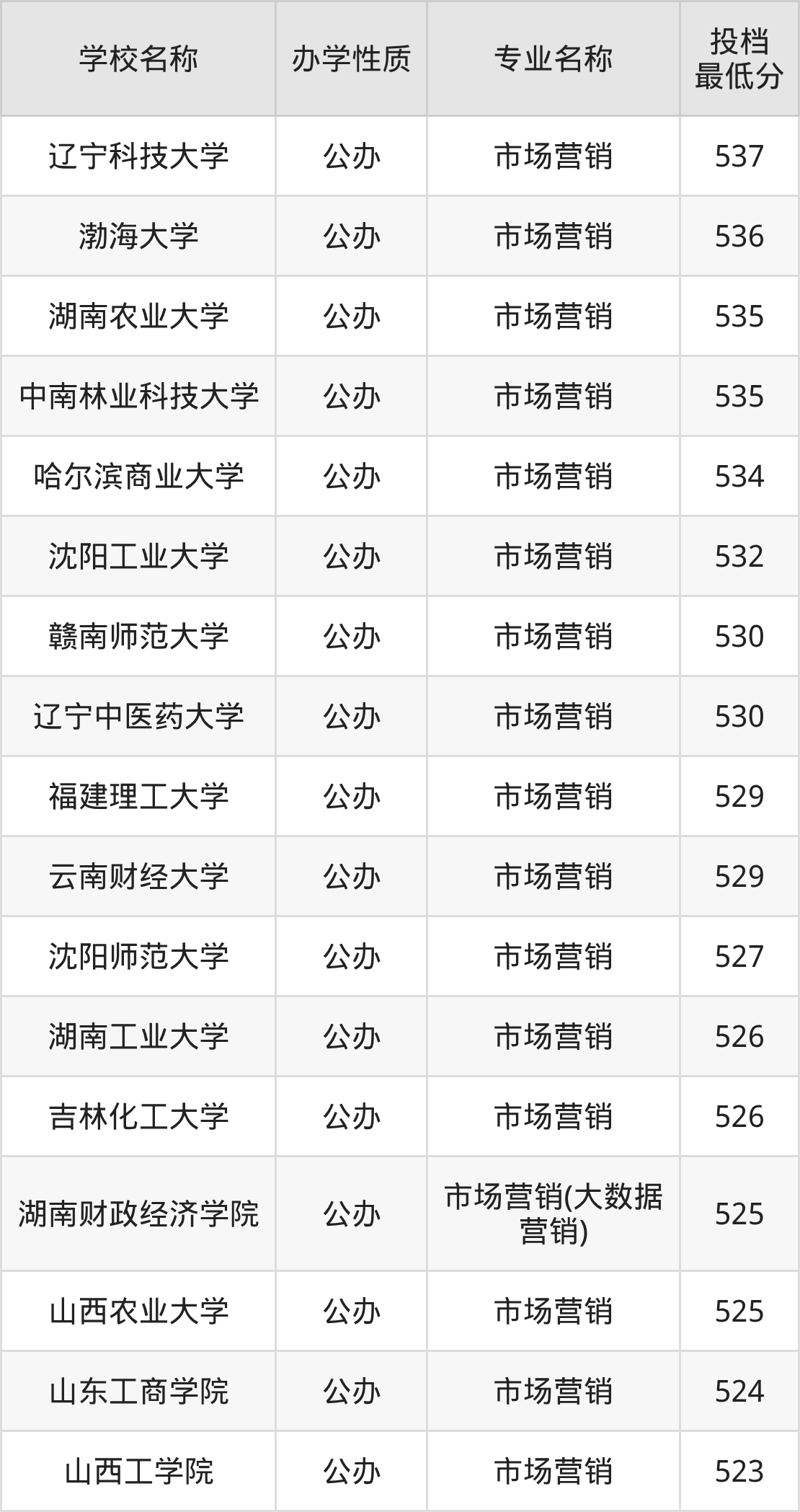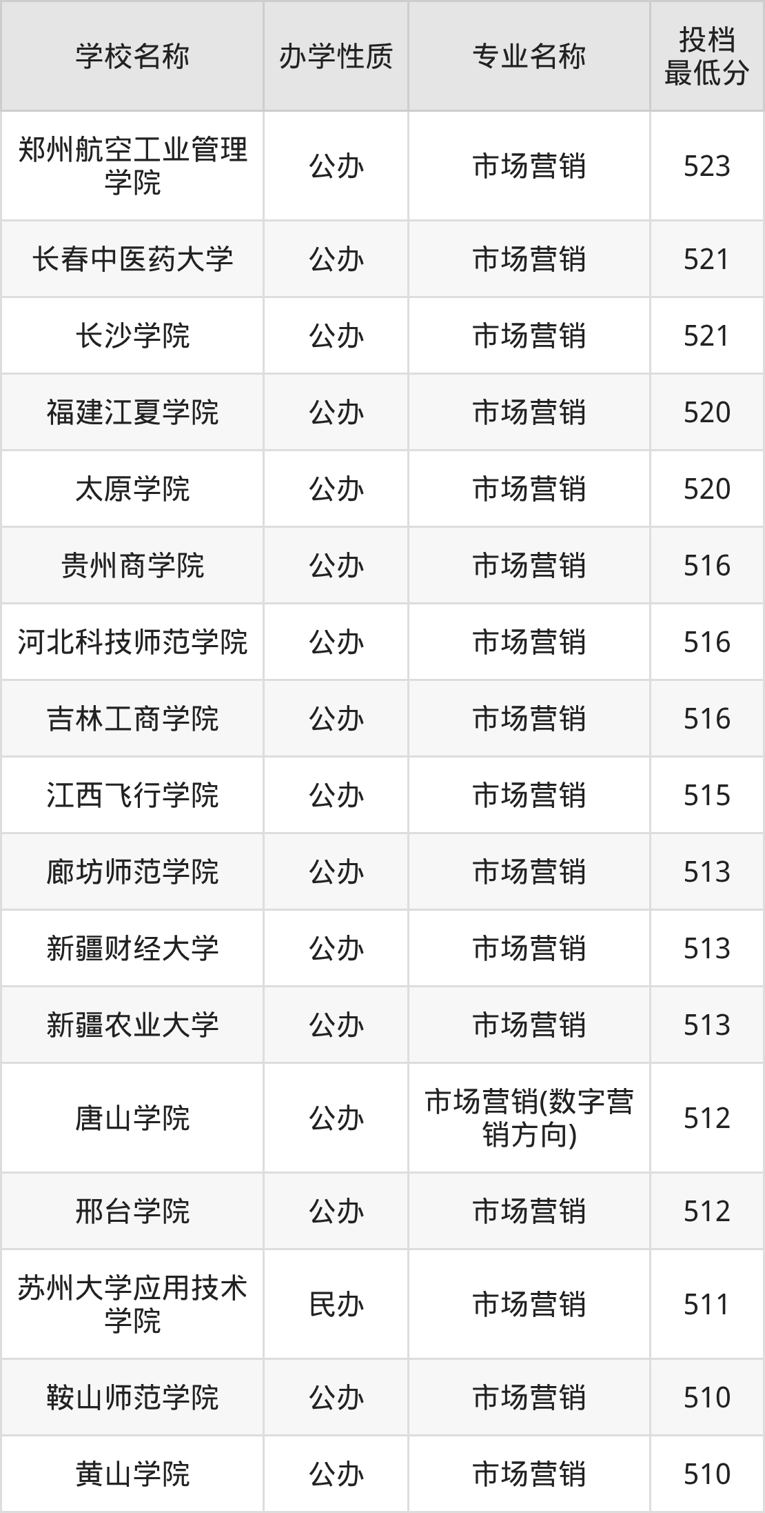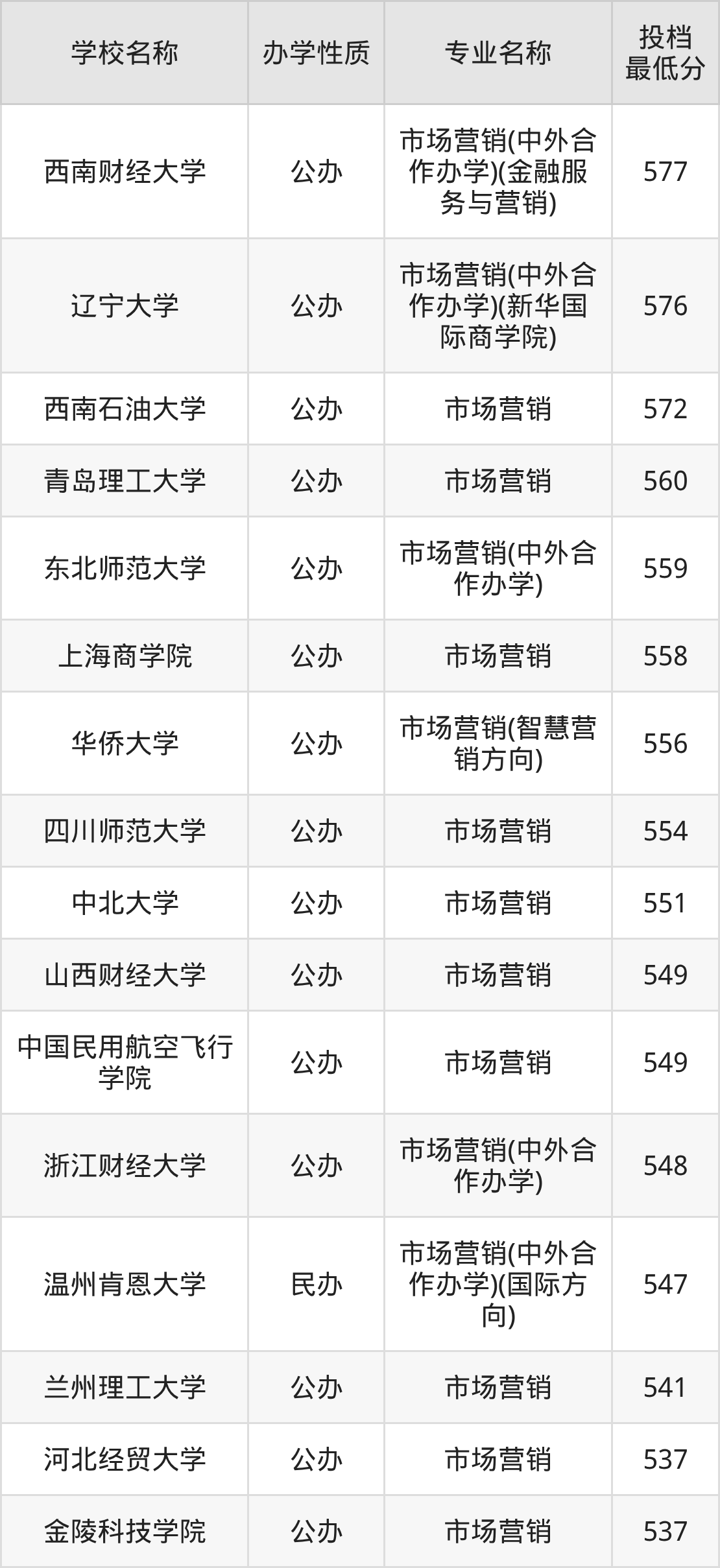 下面是2025年全国所有大学市场营销专业录取分数线一览表(按照分数线从高到低排名):