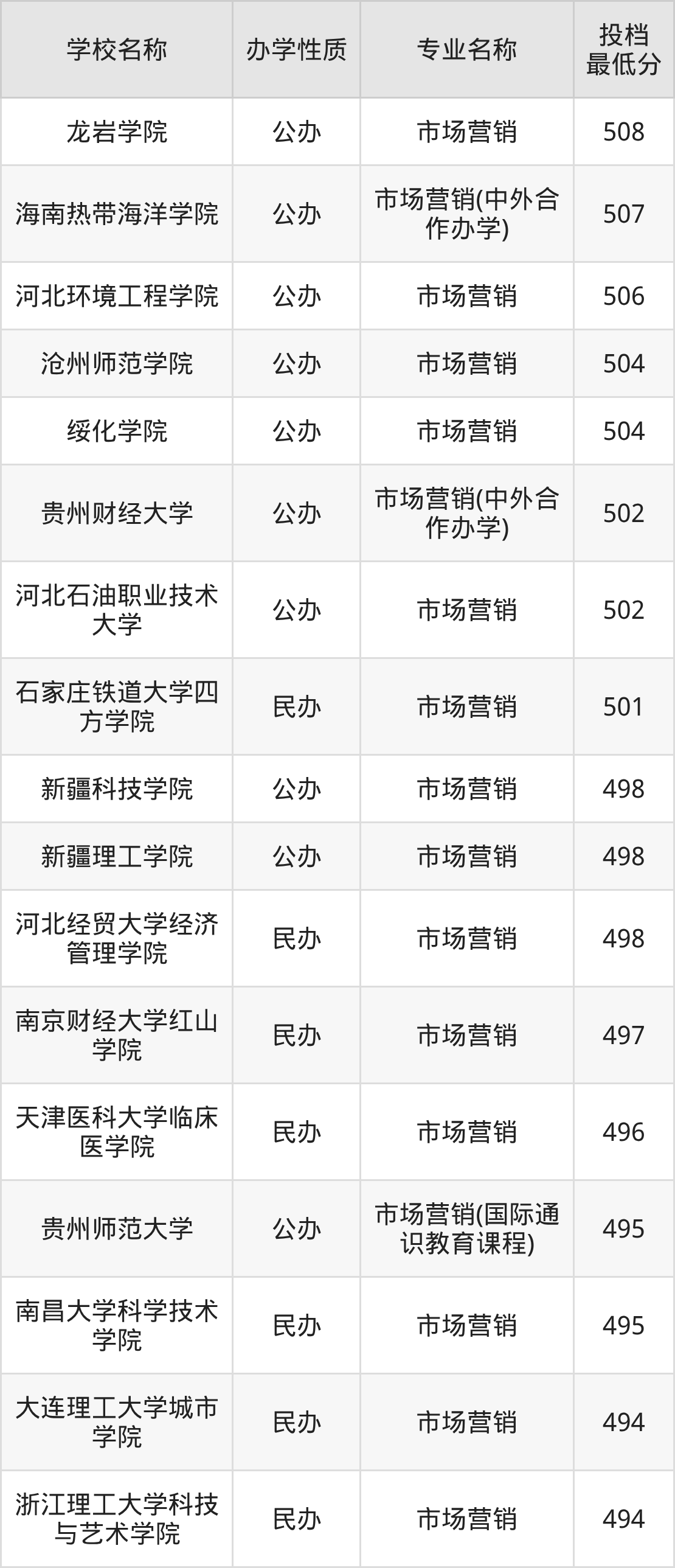 500分左右的市场营销大学:石家庄铁道大学四方学院501分、河北石油职业技术大学502分、贵州财经大学502分(中外合作办学)、绥化学院504分、沧州师范学院504分等;