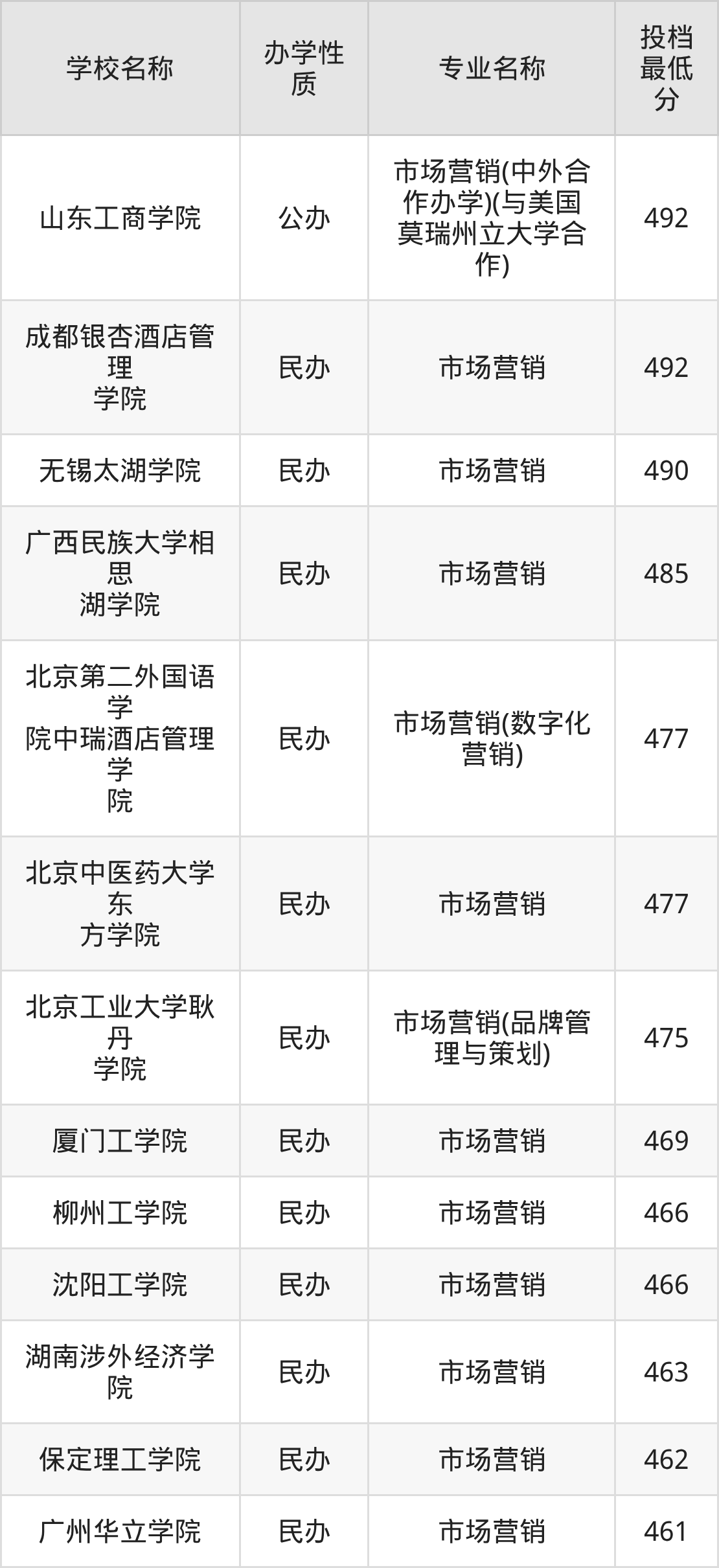 2025年市场营销专业最低录取分数线是461分,超本科分数线(459分)2分。也就是说想报考市场营销专业的同学,至少得超过本科线2分及以上。市场营销专业最低分的大学是广州华立学院,不过该校属于民办。
