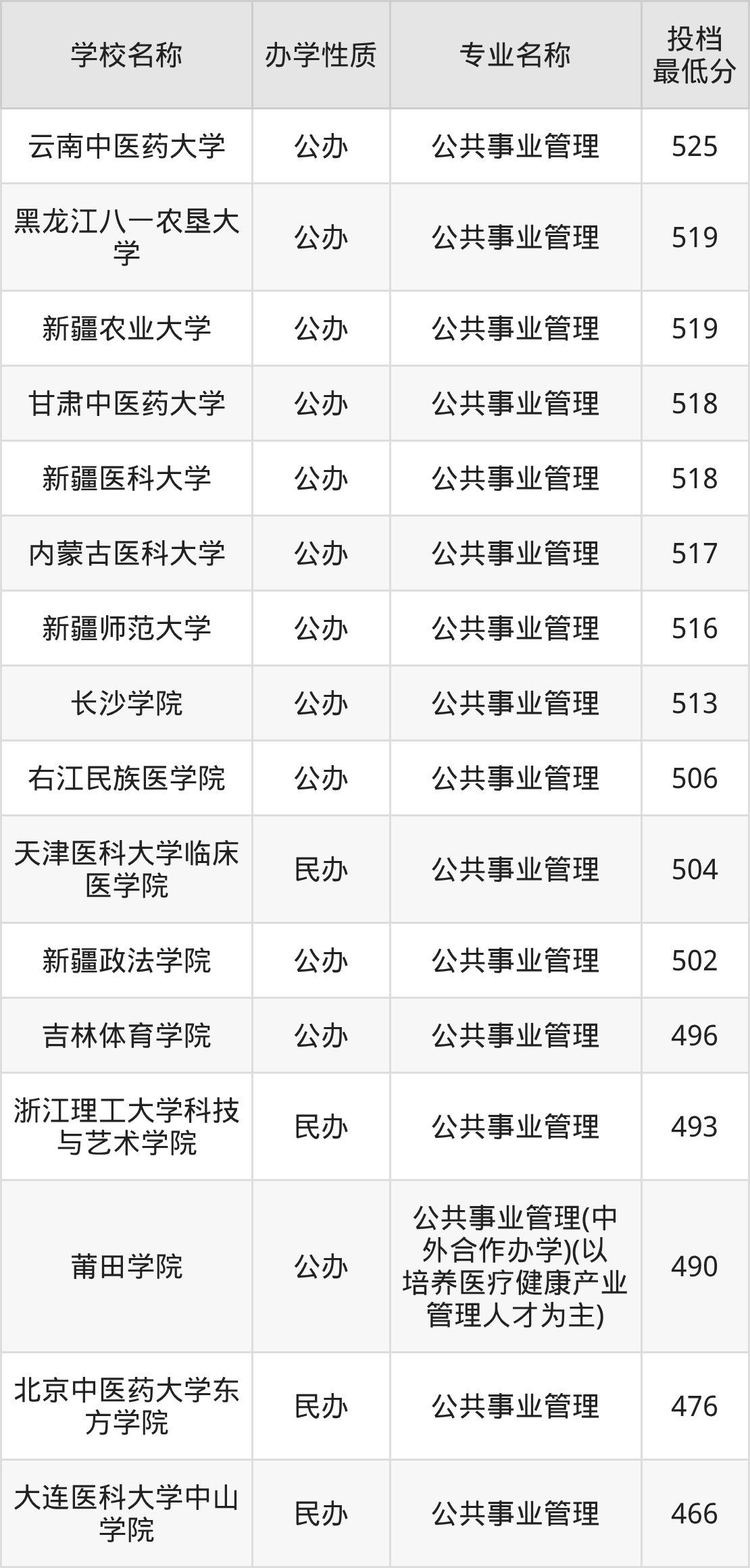500分左右的公共事业管理大学有:新疆农业大学519分、黑龙江八一农垦大学519分、甘肃中医药大学518分、新疆医科大学518分、内蒙古医科大学517分。