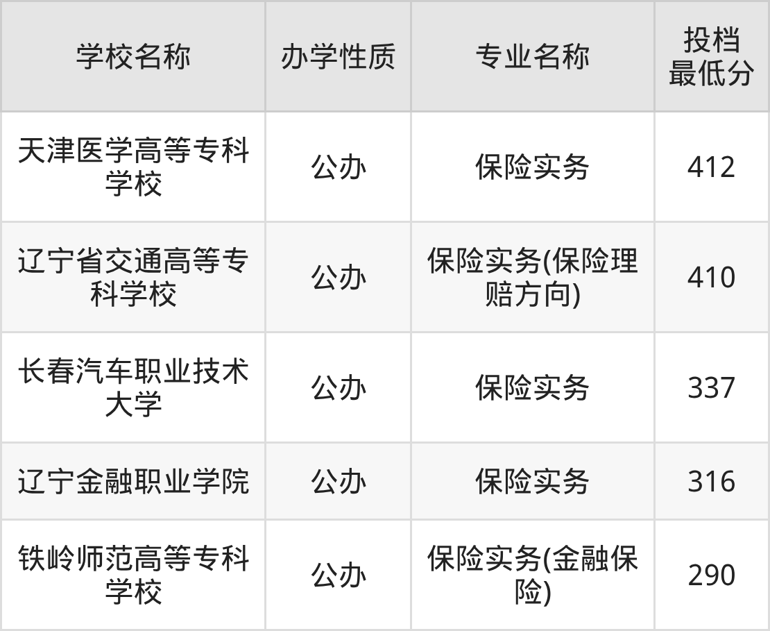 保险实务专业收分最高的大学是天津医学高等专科学校,2025年最低分412分,超专科线262分。分数线排名前五的大学还有:辽宁省交通高等专科学校(保险理赔方向)410分、长春汽车职业技术大学337分、辽宁金融职业学院316分、铁岭师范高等专科学校(金融保险)290分。