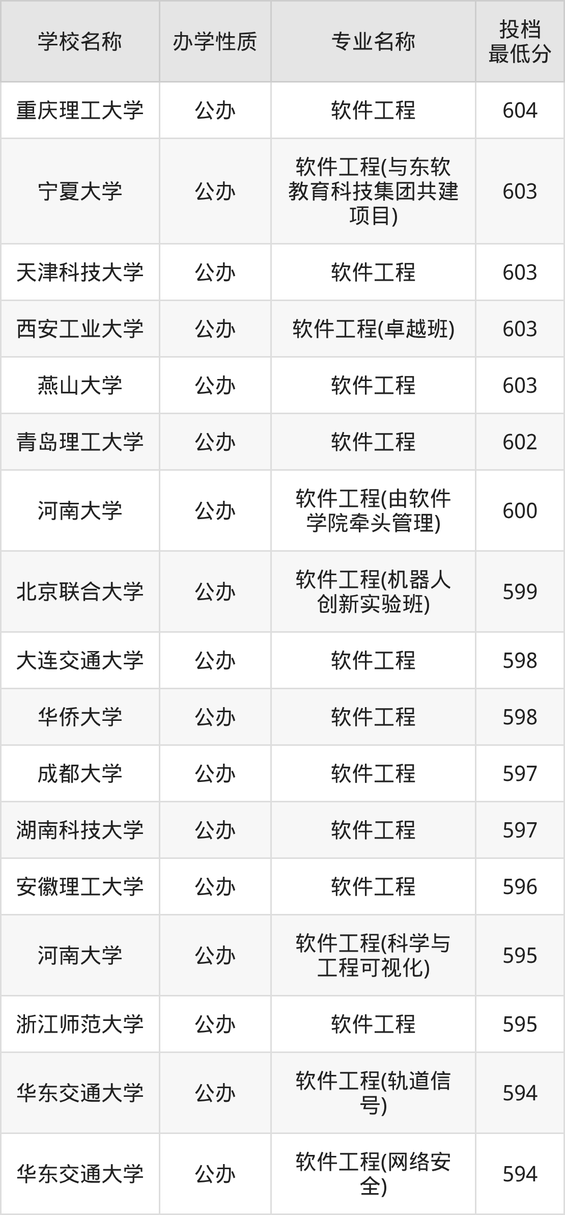 600分左右的软件工程大学:青岛理工大学602分、燕山大学603分、西安工业大学603分(卓越班)、天津科技大学603分、宁夏大学603分(与东软教育科技集团共建项目)等;