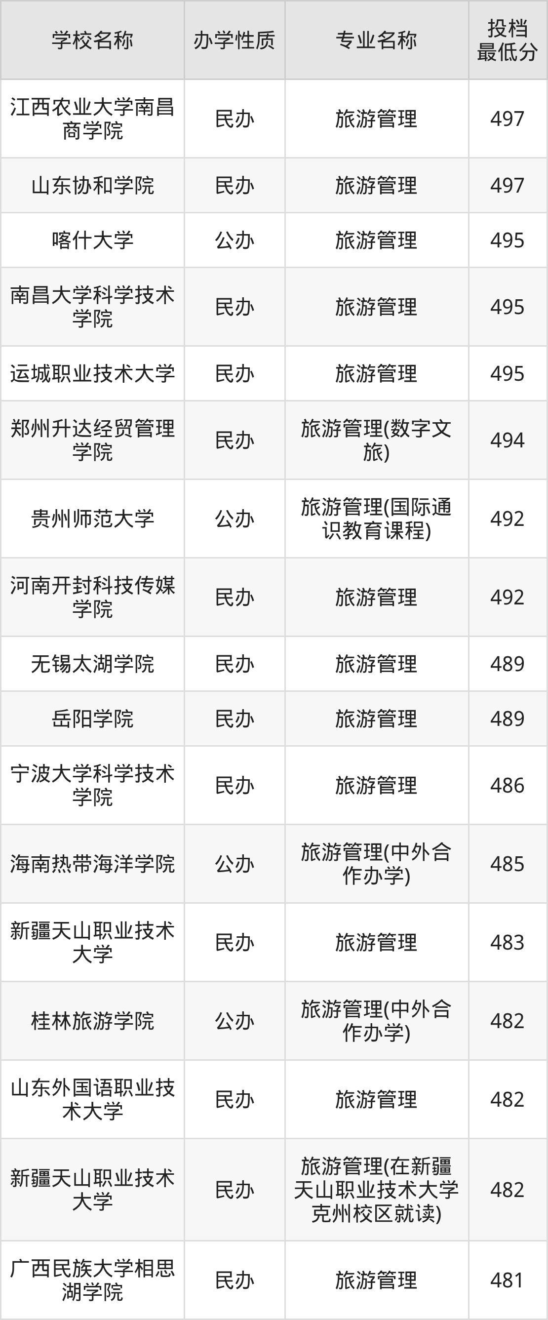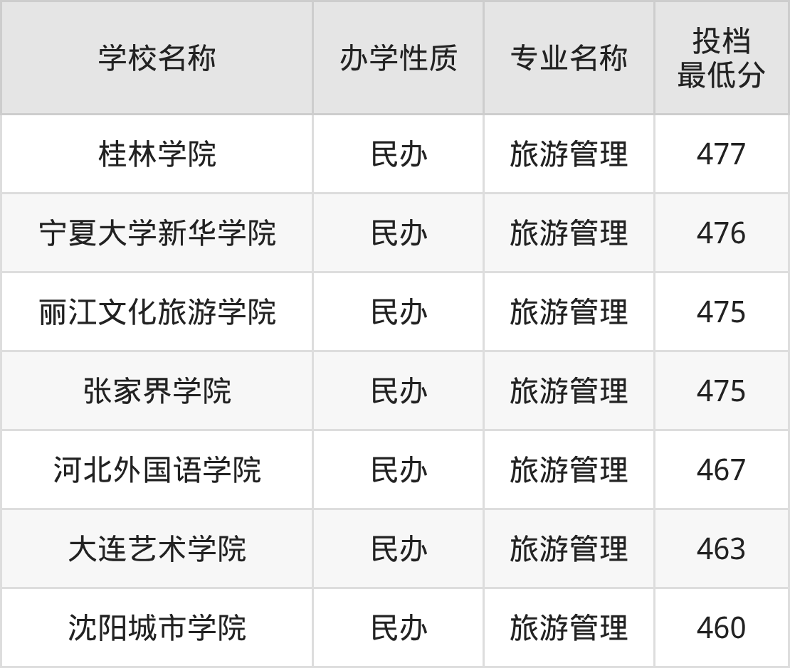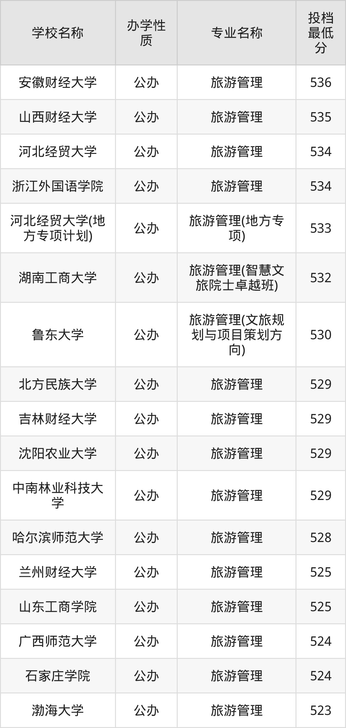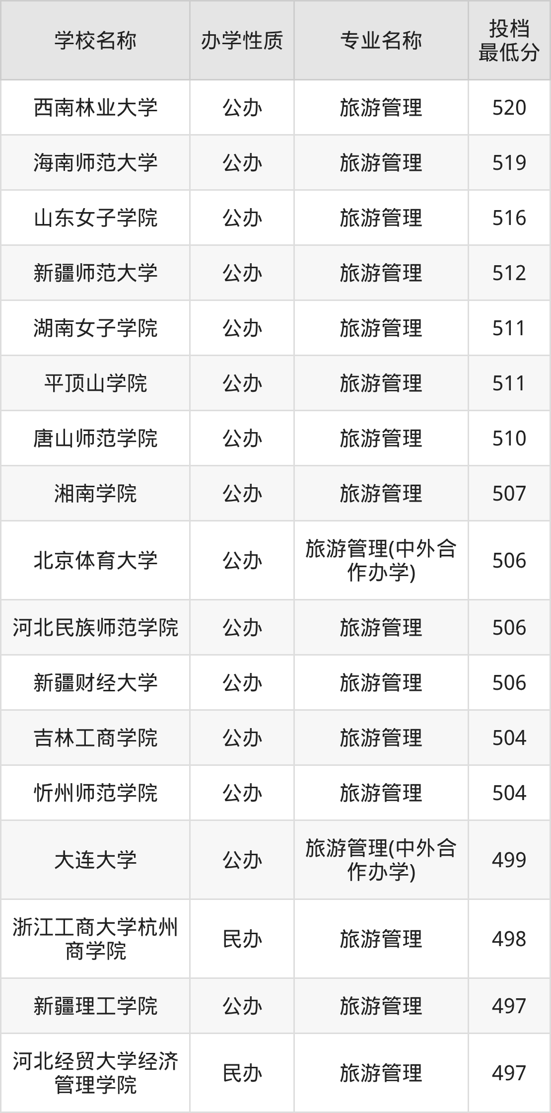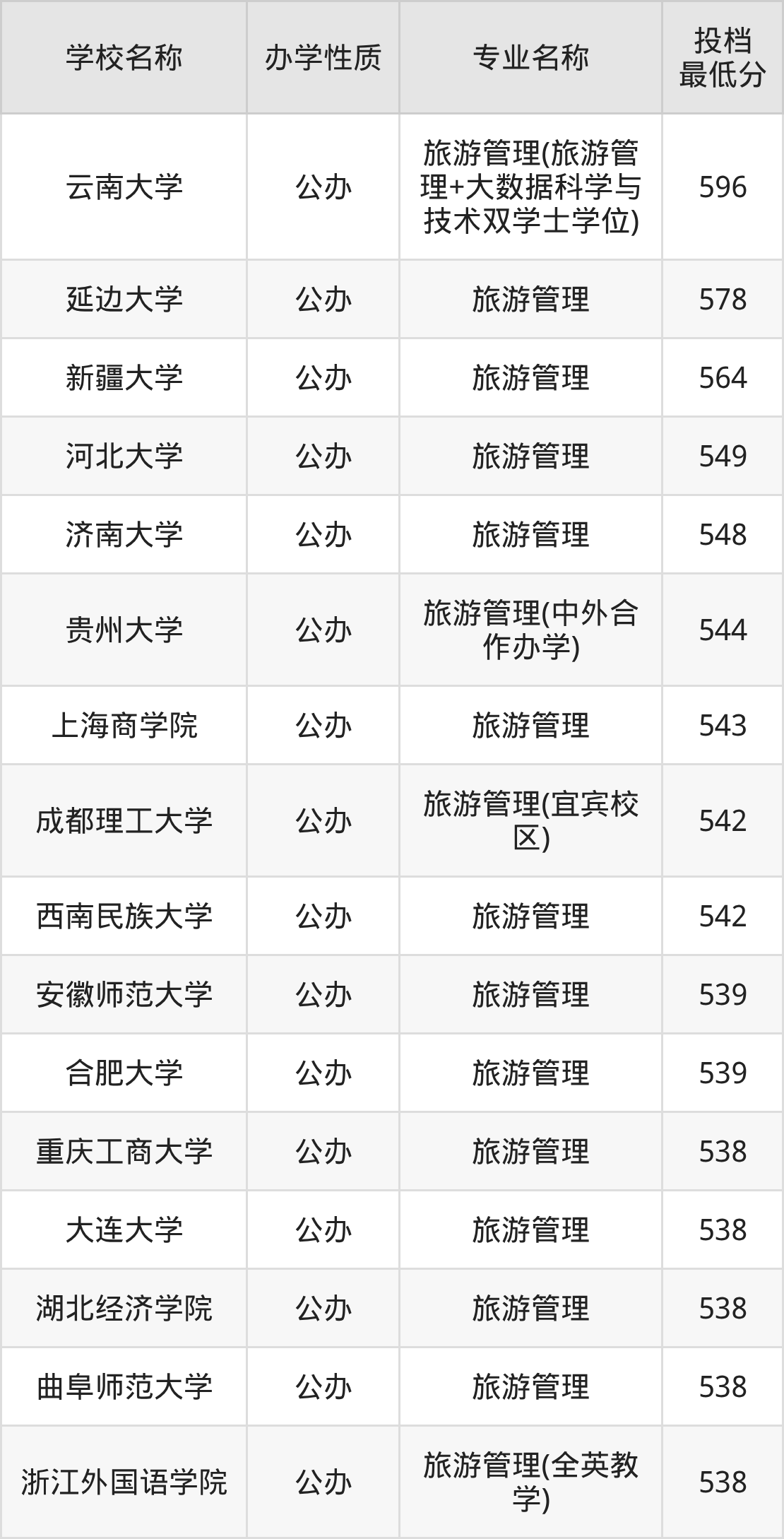 下面是2025年全国所有大学旅游管理专业录取分数线一览表(按照分数线从高到低排名):