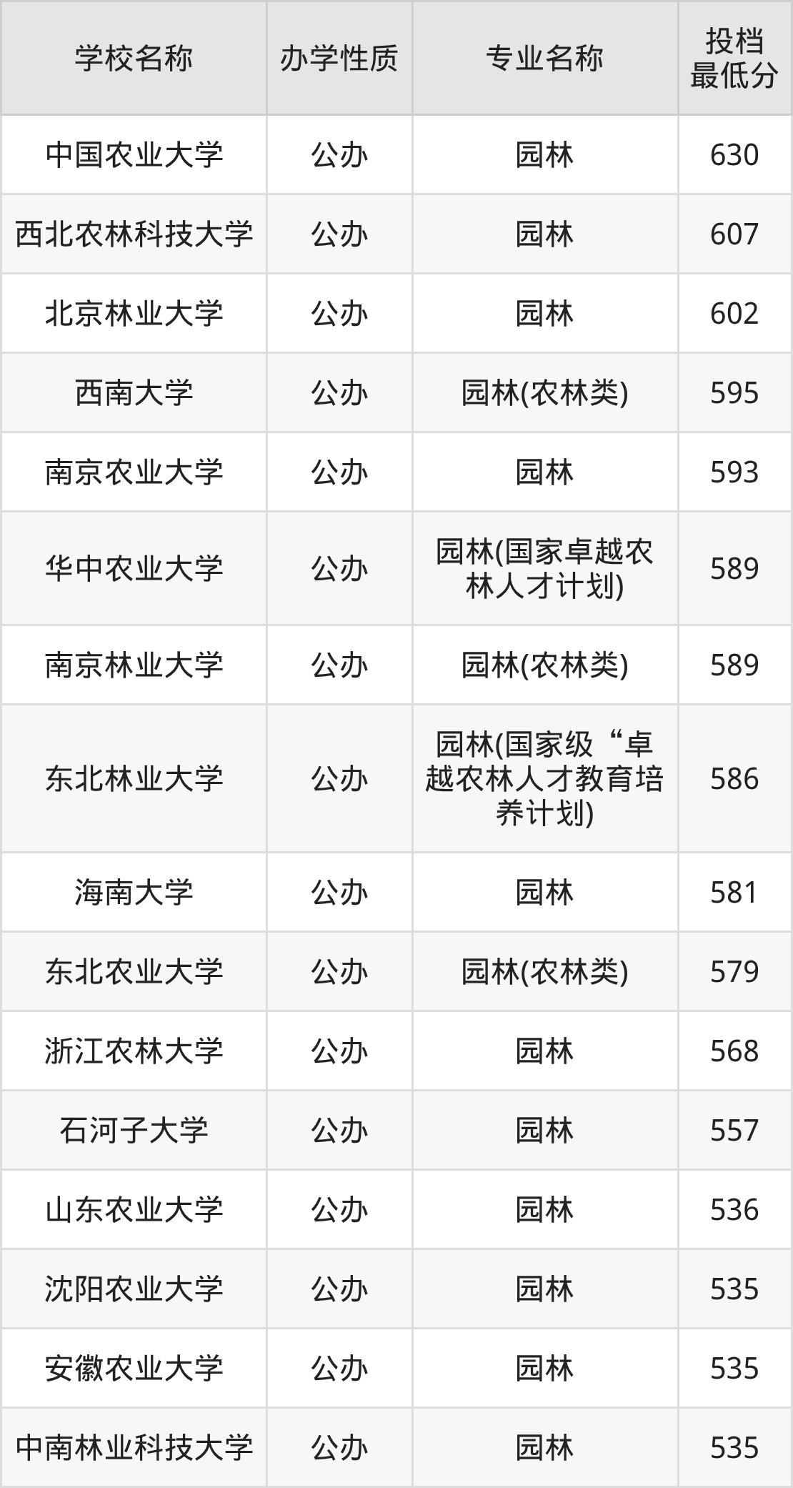 600分左右的园林大学:北京林业大学602分、西北农林科技大学607分、中国农业大学630分等;