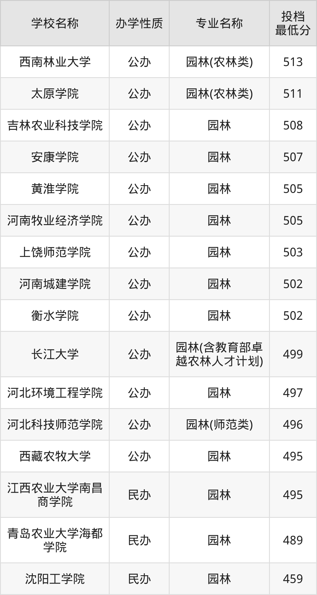 2025年园林专业最低录取分数线是459分,刚好在本科分数线(459分)处。也就是说想报考园林专业的同学,至少得达到本科线459分及以上。园林专业最低分的大学是沈阳工学院,不过该校属于民办。