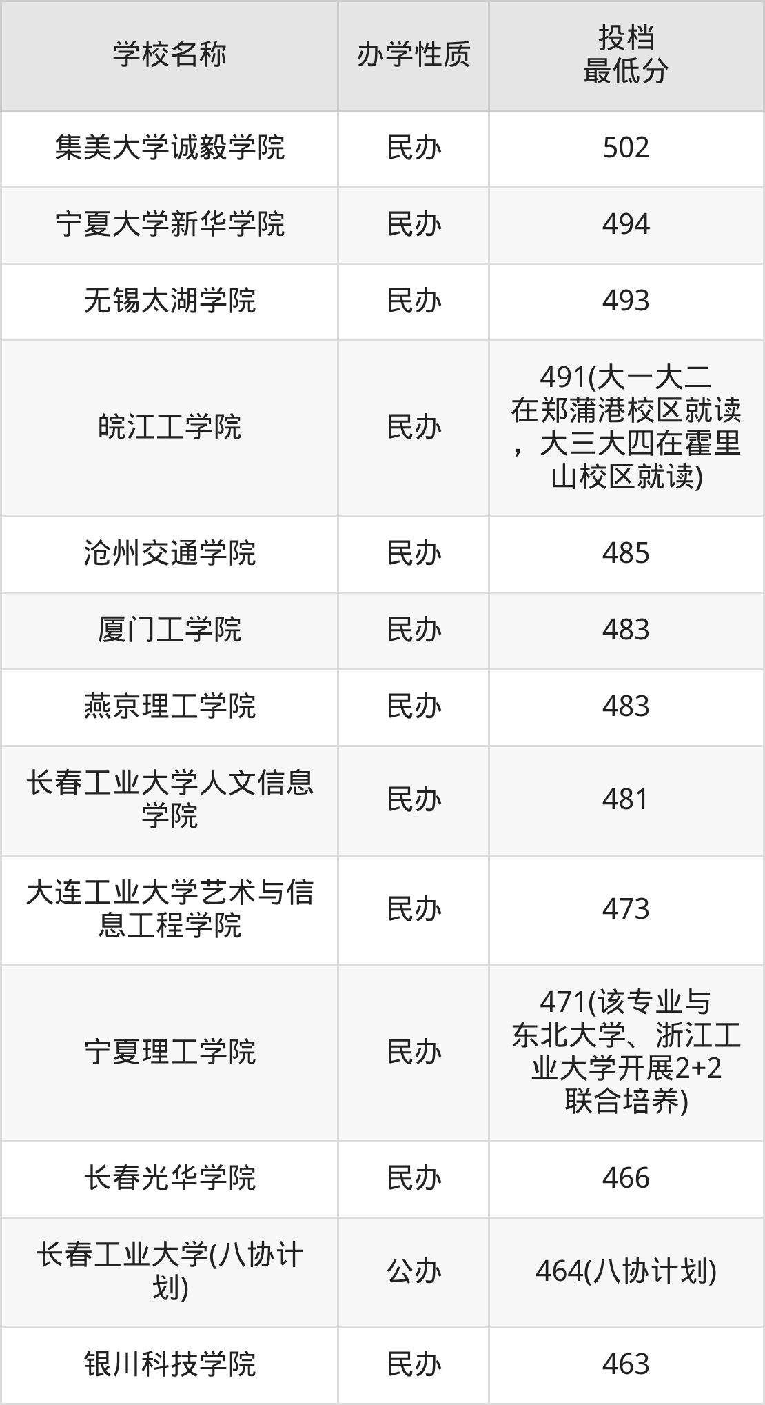 另外分数线比较低的大学还有长春光华学院(466分)、宁夏理工学院(471分)、大连工业大学艺术与信息工程学院(473分)、长春工业大学人文信息学院(481分)、燕京理工学院(483分)等。
