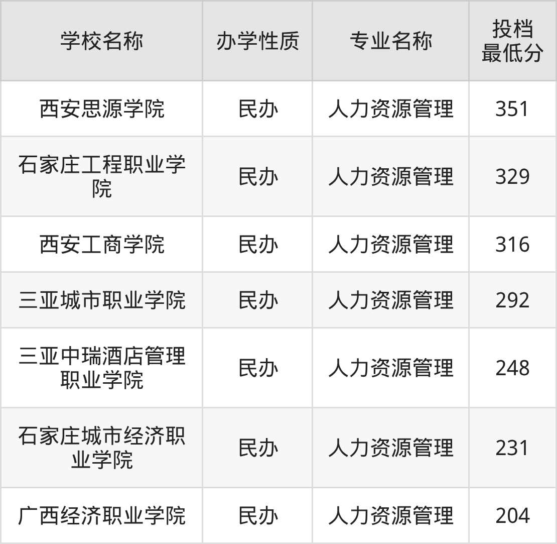 一般来说,人力资源管理都需要200分以上才能被录取,当然分数线因省份、科类而不同。从河北省2025年的招录数据来看,2025年人力资源管理专业最低分是204分,而河北省专科线是200分,意味着考生至少需超过专科线4分才能上。
