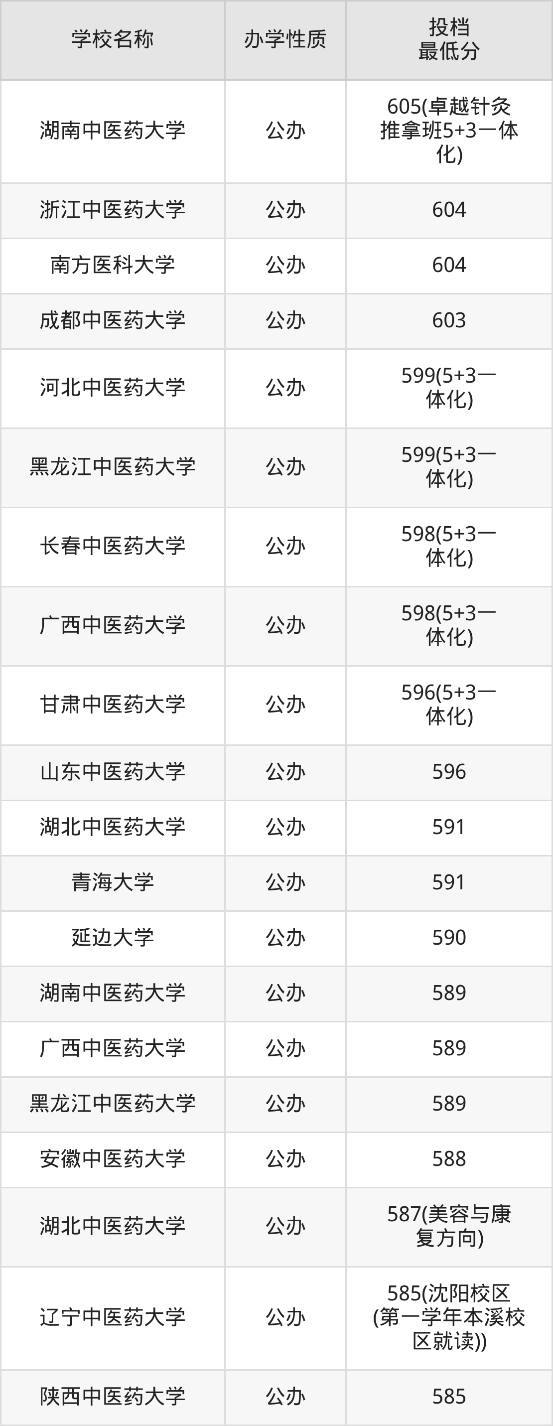 600分左右的中医学大学:成都中医药大学603分、浙江中医药大学604分、南方医科大学604分、湖南中医药大学605分(卓越针灸推拿班5+3一体化)、湖南中医药大学609分(卓越中医儿科班5+3一体化)等;