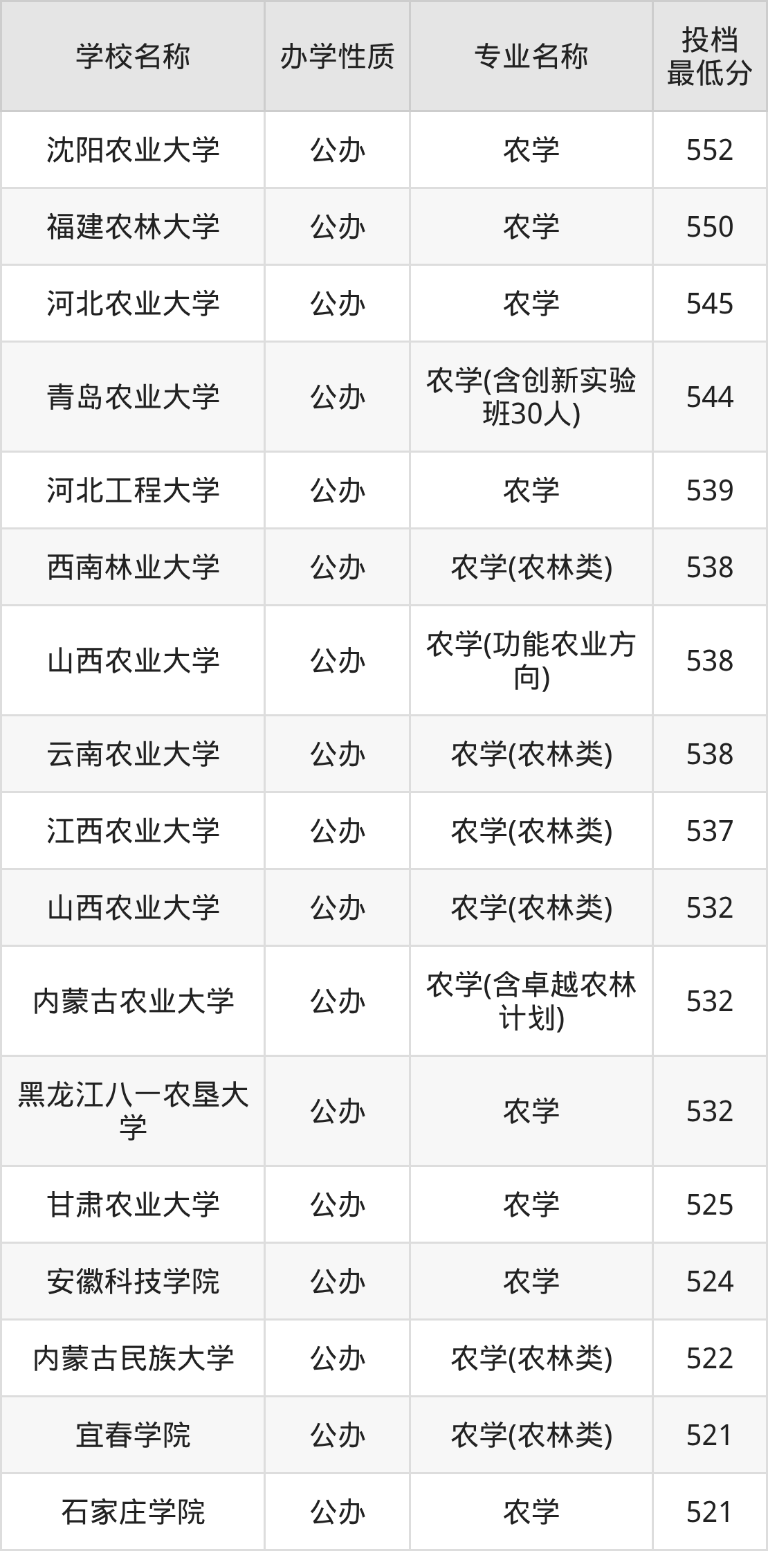 下面是全国各个大学农学专业最低录取分数线排名一览表,考生可根据自己的分数情况选择合适的学校报考。