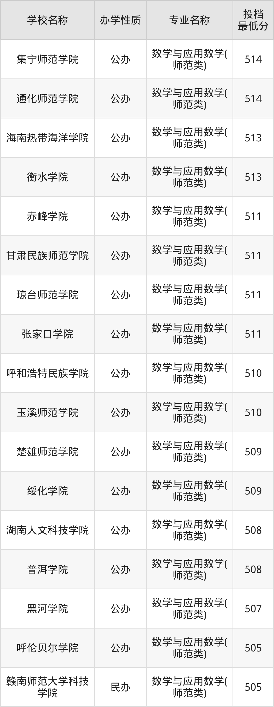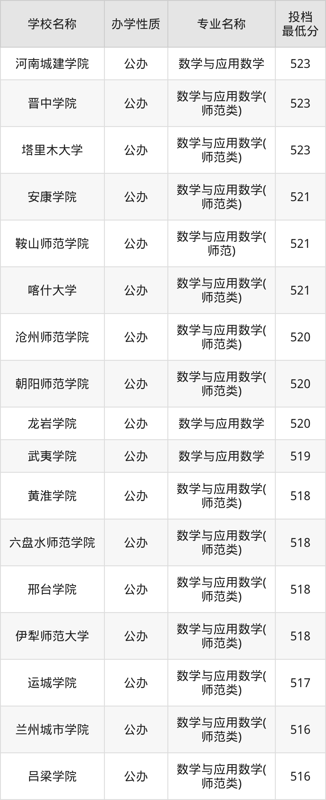 500分左右的数学与应用数学大学有:沧州师范学院520分、朝阳师范学院520分、龙岩学院520分、武夷学院519分、黄淮学院518分。